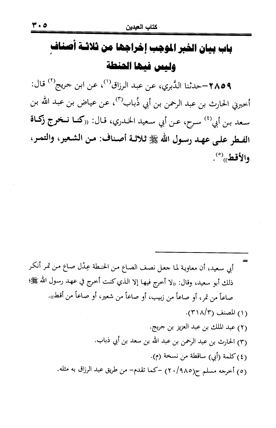 2859 - حدثنا الدَّبري، عن عبد الرزاق (¬1)، عن ابن جريج (¬2) قال: أخبرني الحارث بن عبد الرحمن بن أبي ذُباب (¬3)، عن عياض بن عبد الله بن سعد بن أبي (¬4) سرح، عن أبي سعيد الخدري، قال: "كنا نخرج زكاة الفطر على عهد رسول الله -صلى الله عليه وسلم- ثلانة أصناف: من الشعير، والتمر، والأقط" (¬5).