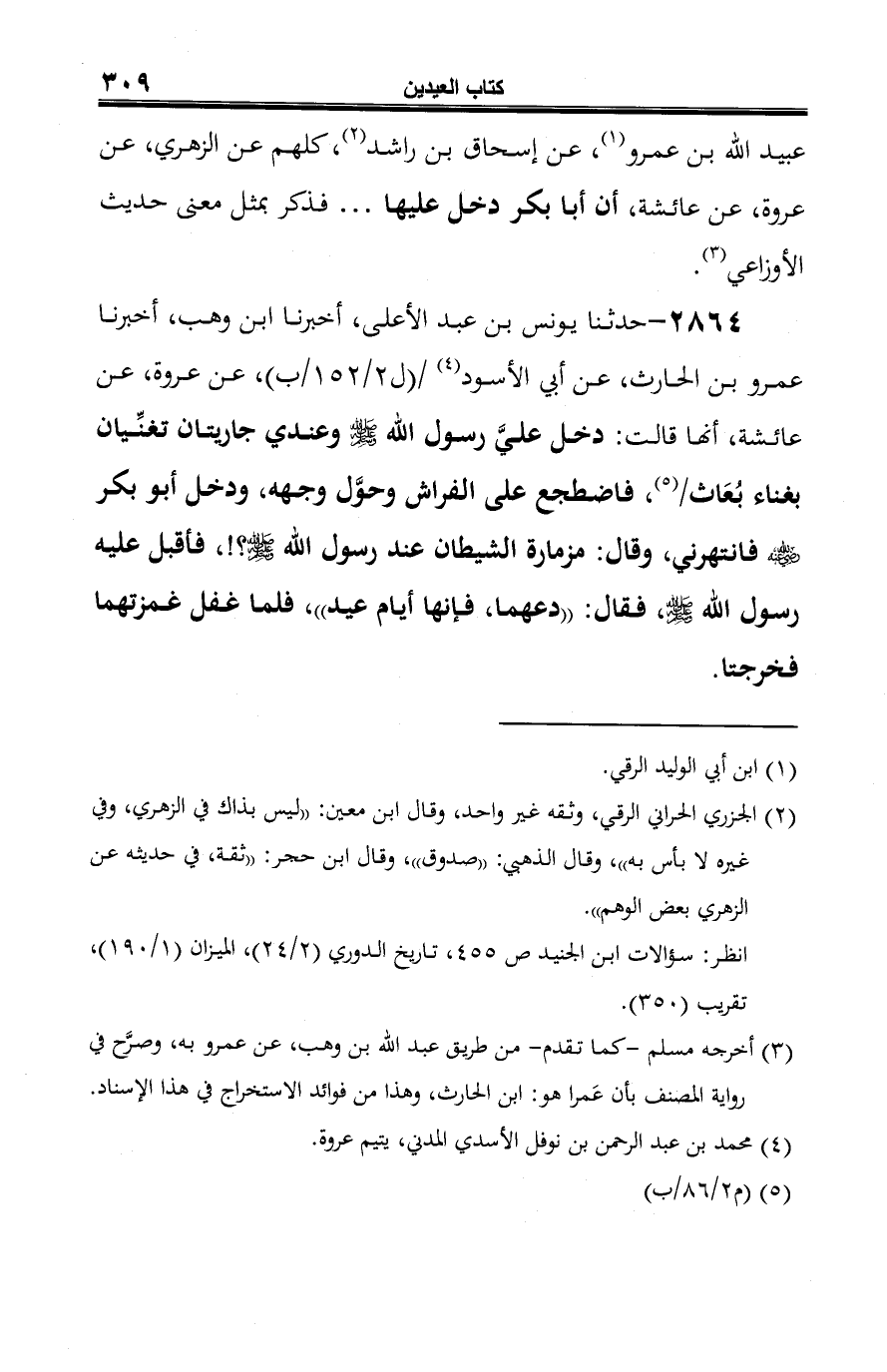 2864 - حدثنا يونس بن عبد الأعلى، أخبرنا ابن وهب، أخبرنا عمرو بن الحارث، عن أبي الأسود (¬1)، عن عروة، عن عائشة، أنها قالت: دخل عليَّ رسول الله -صلى الله عليه وسلم- وعندي جاريتان تغنِّيان بغناء بُعَاث (¬2)، فاضطجع على الفراش وحوَّل وجهه، ودخل أبو بكر -رضي الله عنه- فانتهرني، وقال: مزمارة الشيطان عند رسول الله -صلى الله عليه وسلم-؟!، فأقبل عليه رسول الله -صلى الله عليه وسلم-، فقال: "دعهما، فإنها أيام عيد"، فلما غفل غمزتهما فخرجتا.