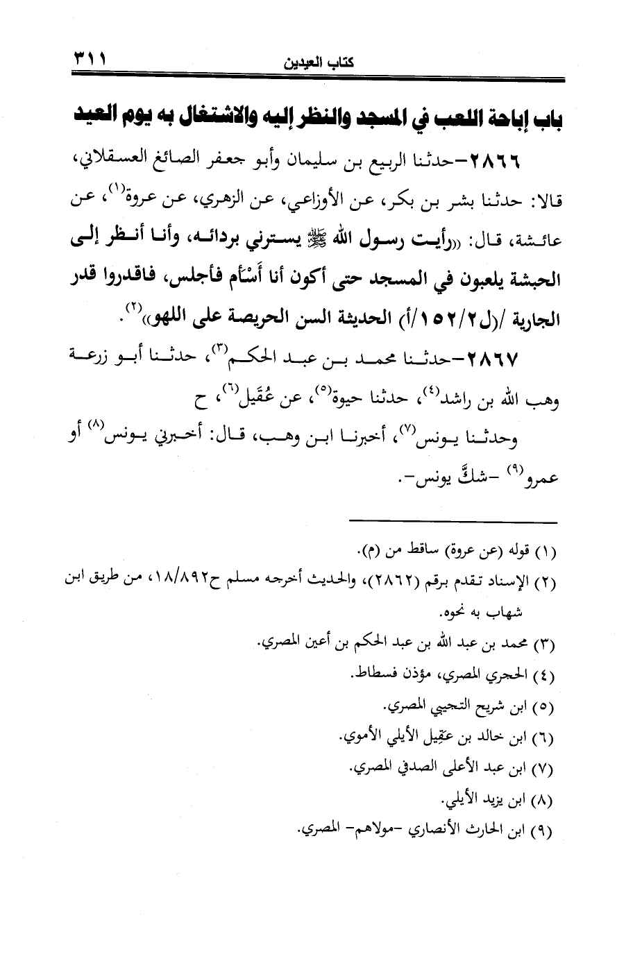 2866 - حدثنا الربيع بن سليمان وأبو جعفر الصائغ العسقلاني، قالا: حدثنا بشر بن بكر، عن الأوزاعي، عن الزهري، عن عروة (¬1)، عن عائشة، قال: "رأيت رسول الله -صلى الله عليه وسلم- يسترني بردائه، وأنا أنظر إلى الحبشة يلعبون في المسجد حتى أكون أنا أَسْأَم فأجلس، فاقدروا قدر الجارية الحديثة السن الحريصة على اللهو" (¬2).