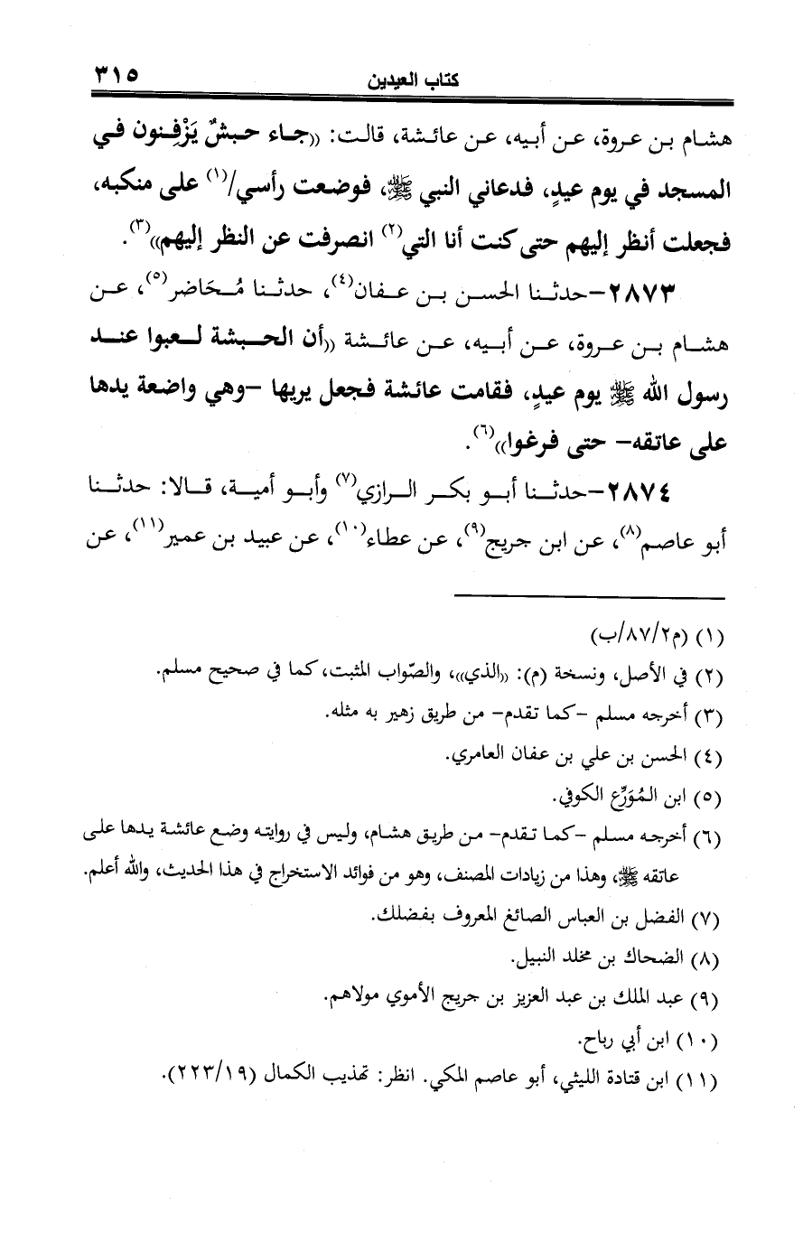 2873 - حدثنا الحسن بن عفان (¬1)، حدثنا مُحَاضر (¬2)، عن هشام بن عروة، عن أبيه، عن عائشة "أن الحبشة لعبوا عند رسول الله -صلى الله عليه وسلم- يوم عيدٍ، فقامت عائشة فجعل يريها -وهي واضعة يدها على عاتقه- حتى فرغوا" (¬3).