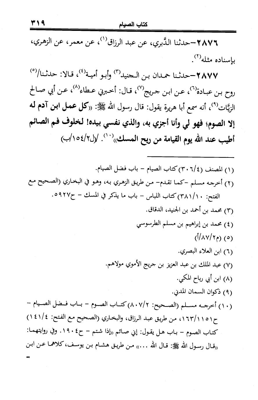 (¬8) أخرجه مسلم (الصحيح: 2/ 807) كتاب الصوم -باب فضل الصيام- ح 1151/ 163، من طريق عبد الرزاق، والبخاري (الصحيح مع الفتح: 4/ 141) كتاب الصوم -باب هل يقول: إني صائم "إذا شتم- ح 1904. وفي روايتهما: "قال رسول الله -صلى الله عليه وسلم-: قال الله. . ." من طريق هشام بن يوسف، كلاهما عن ابن =