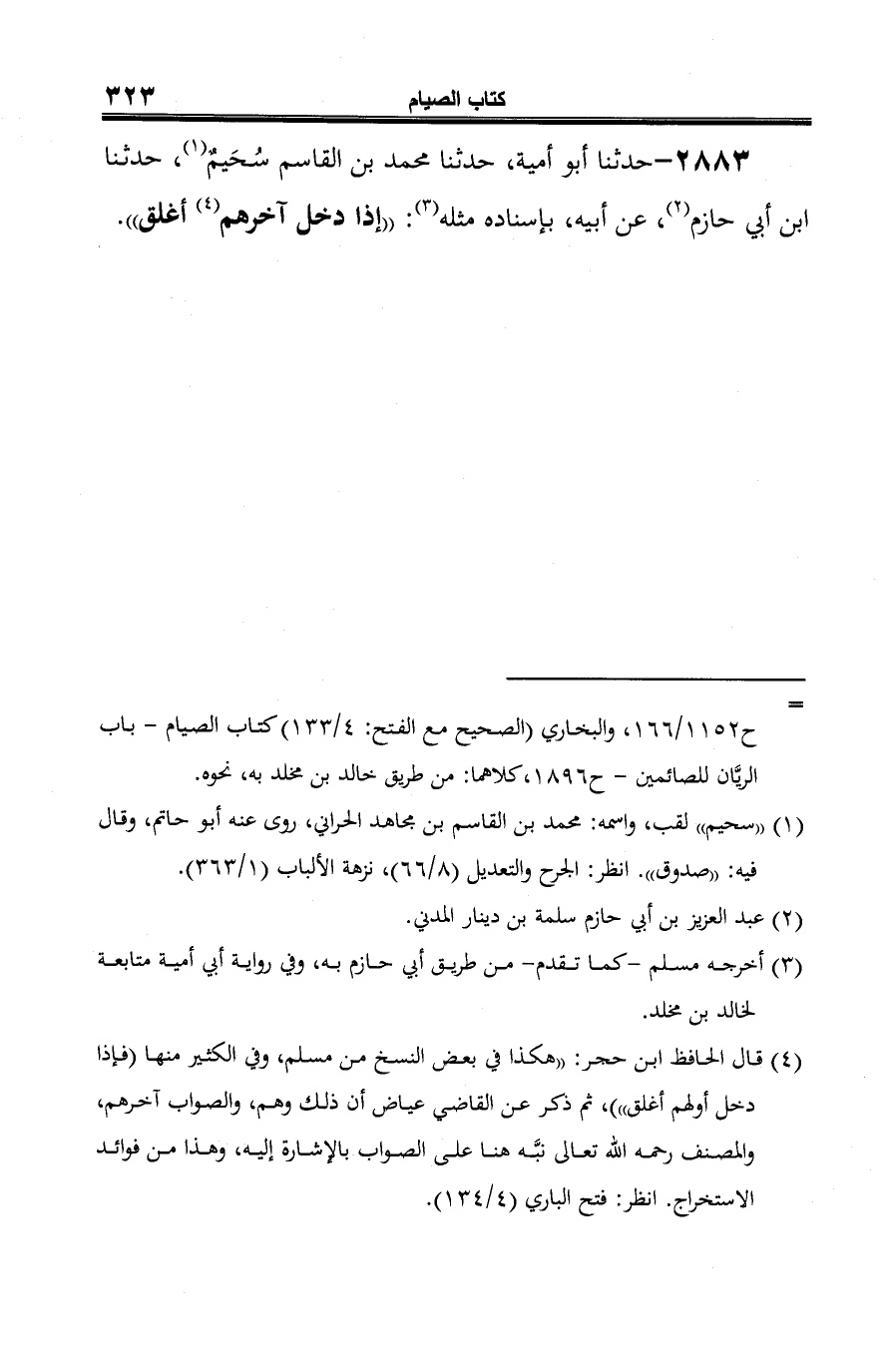 2883 - حدثنا أبو أمية، حدثنا محمد بن القاسم سُحَيمٌ (¬1)، حدثنا ابن أبي حازم (¬2)، عن أبيه، بإسناده مثله (¬3): "إذا دخل آخرهم (¬4) أغلق".
