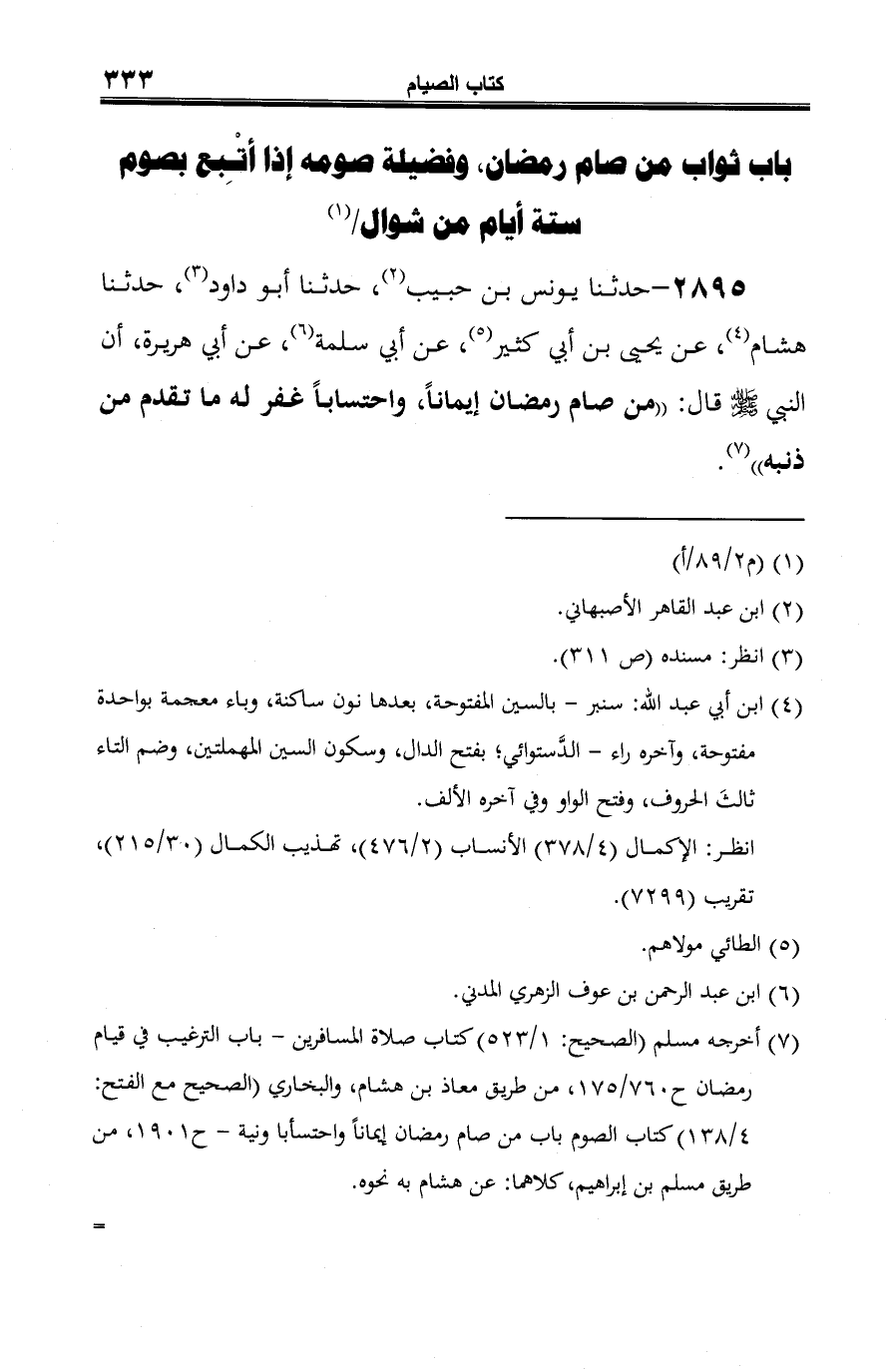 2895 - حدثنا يونس بن حبيب (¬1)، حدثنا أبو داود (¬2)، حدثنا هشام (¬3)، عن يحيى بن أبي كثير (¬4)، عن أبي سلمة (¬5)، عن أبي هريرة، أن النبي -صلى الله عليه وسلم- قال: "من صام رمضان إيمانًا، واحتسابًا غفر له ما تقدم من ذنبه" (¬6).
