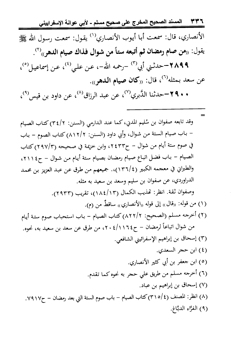 (¬2) انظر: المصنف (4/ 315) كتاب الصيام -باب صوم الستة التي بعد رمضان- ح 7917.