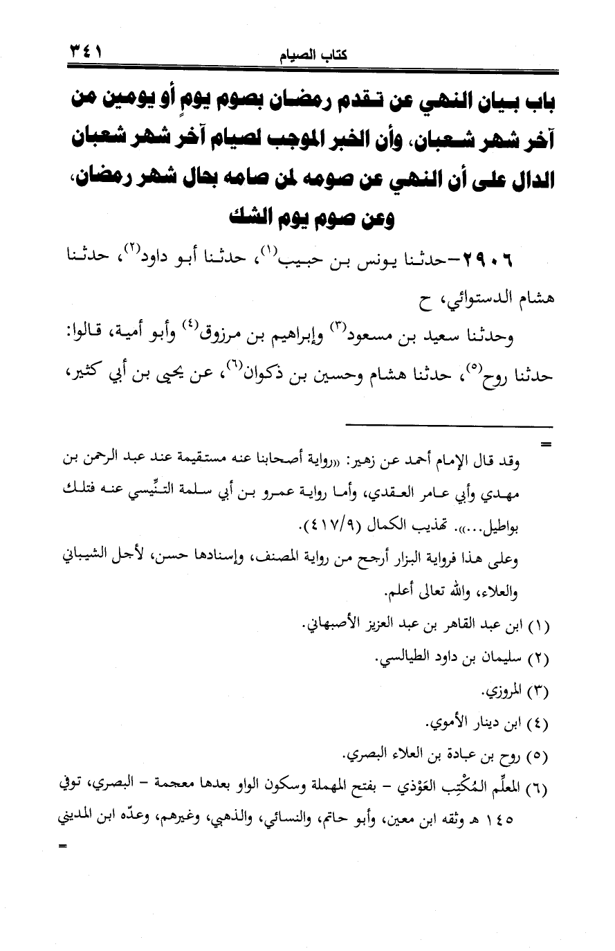 (¬9) أخرجه مسلم (الصحيح: 2/ 762) كتاب الصيام -باب لا تقدموا رمضان بصوم يومٍ ولا يومين- ح 1082/ 21 من طريق هشام به، والبخاري (الصحيح مع الفتح: 4/ 152) كتاب الصوم -باب لا يتقدم رمضان بصوم يومٍ ولا يومين- ح 1914، من طريق هشام أيضا به نحوه.