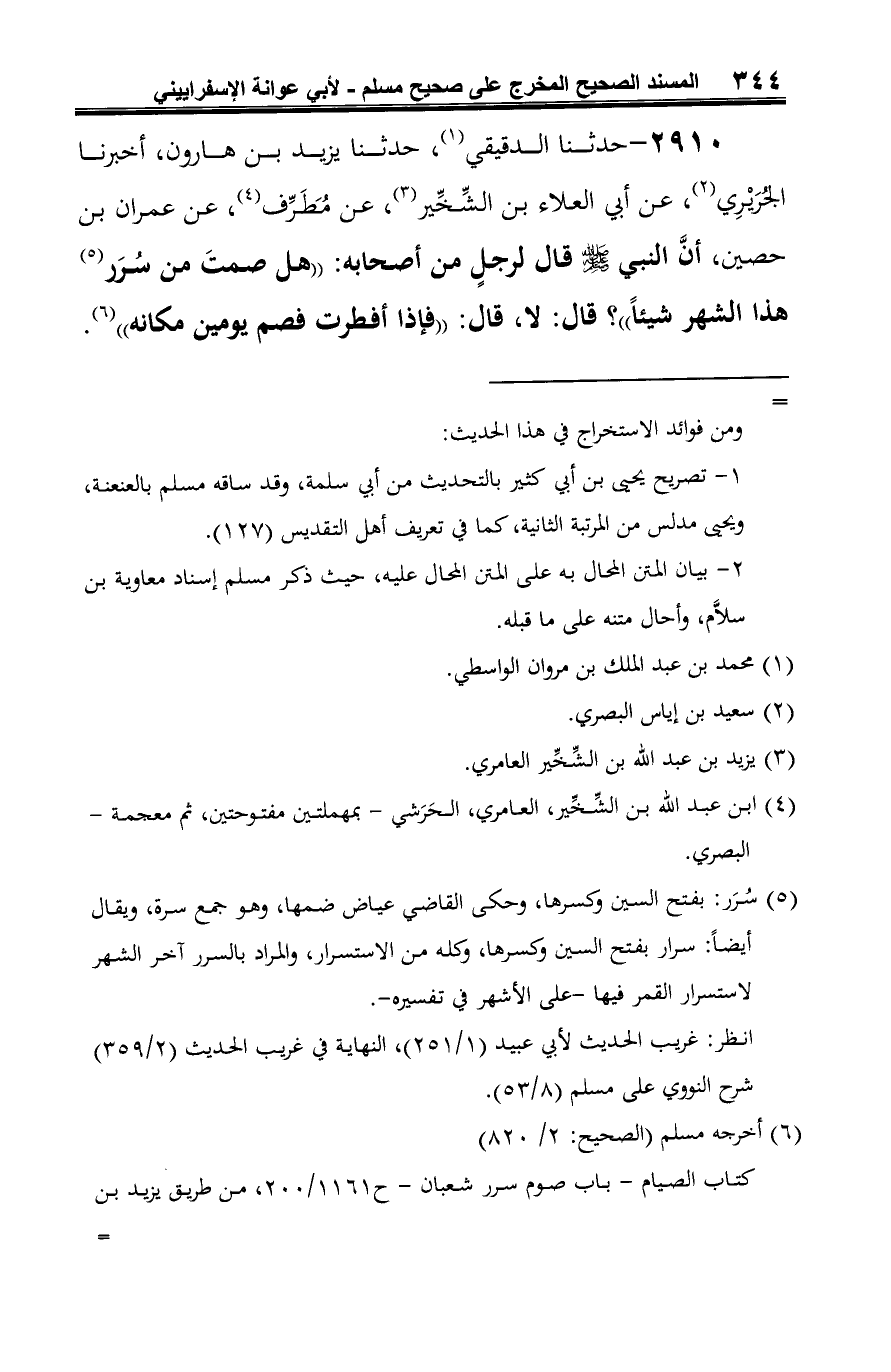 2910 - حدثنا الدقيقي (¬1)، حدثنا يزيد بن هارون، أخبرنا الجُرَيْرِي (¬2)، عن أبي العلاء بن الشِّخِّير (¬3)، عن مُطَرِّف (¬4)، عن عمران بن حصين، أنَّ النبي -صلى الله عليه وسلم- قال لرجلٍ من أصحابه: "هل صمتَ من سُرَر (¬5) هذا الشهر شيئًا"؟ قال: لا، قال: "فإذا أفطرت فصم يومين مكانه" (¬6).