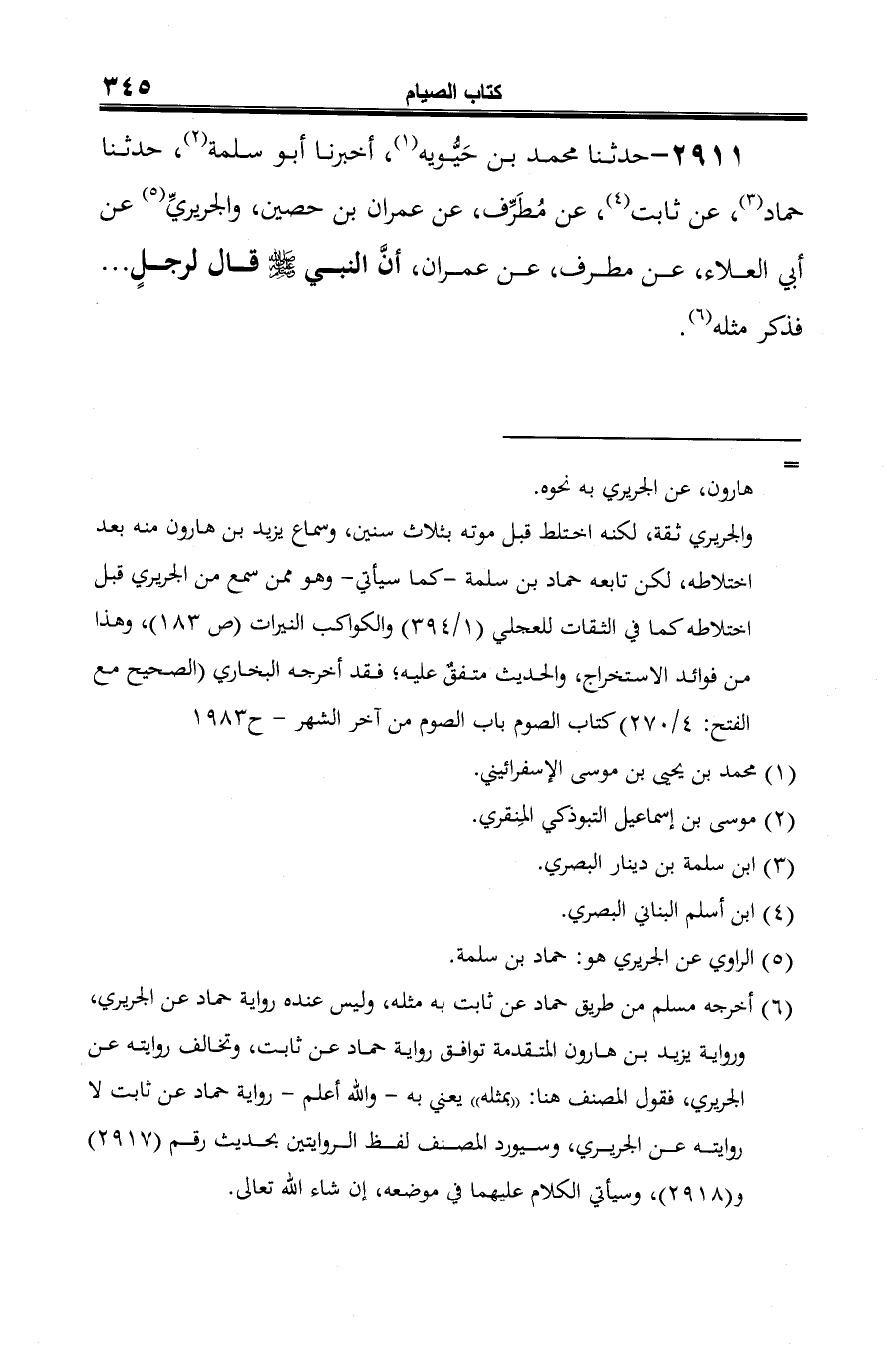 2911 - حدثنا محمد بن حَيُّويه (¬1)، أخبرنا أبو سلمة (¬2)، حدثنا حماد (¬3)، عن ثابت (¬4)، عن مُطَرِّف، عن عمران بن حصين، والجريريِّ (¬5) عن أبي العلاء، عن مطرف، عن عمران، أنَّ النبي -صلى الله عليه وسلم- قال لرجلٍ. . . فذكر مثله (¬6).