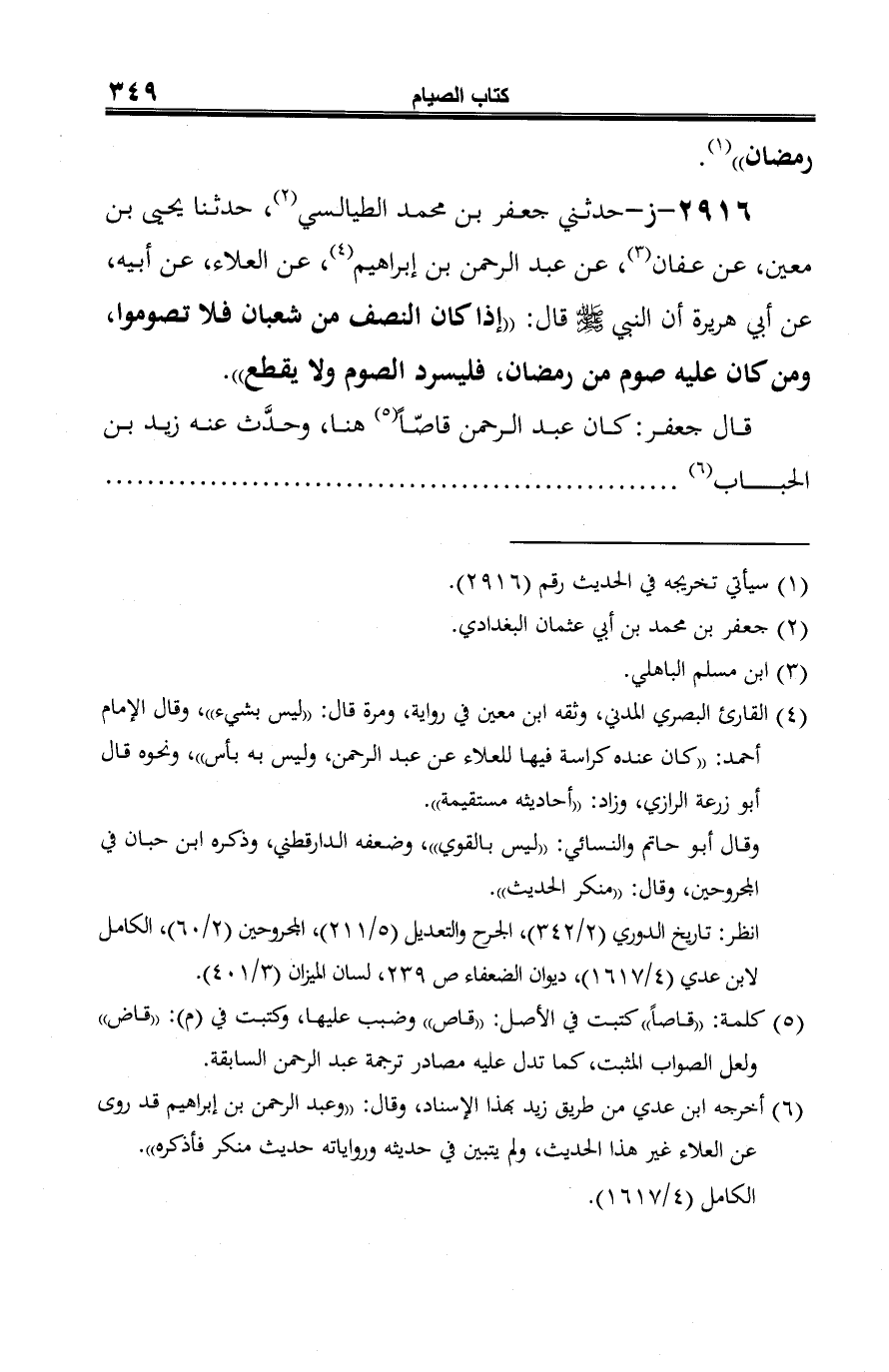 2916 - ز- حدثني جعفر بن محمد الطيالسي (¬1)، حدثنا يحيى بن معين، عن عفان (¬2)، عن عبد الرحمن بن إبراهيم (¬3)، عن العلاء، عن أبيه، عن أبي هريرة أن النبي -صلى الله عليه وسلم- قال: "إذا كان النصف من شعبان فلا تصوموا، ومن كان عليه صوم من رمضان، فليسرد الصوم ولا يقطع".