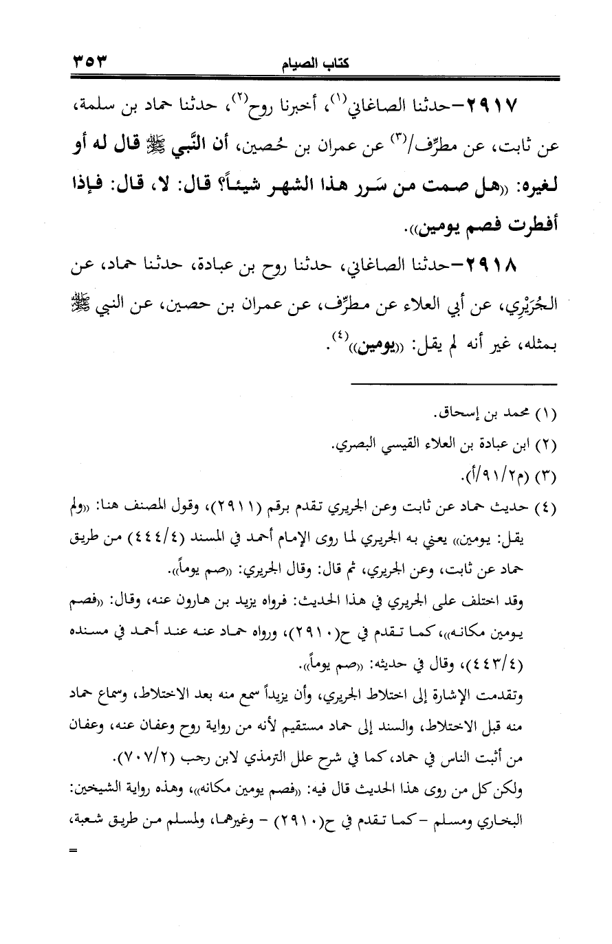 2918 - حدثنا الصاغاني، حدثنا روح بن عبادة، حدثنا حماد، عن الجُرَيْرِي، عن أبي العلاء عن مطرِّف، عن عمران بن حصين، عن النبي -صلى الله عليه وسلم- بمثله، غير أنه لم يقل: "يومين" (¬1).