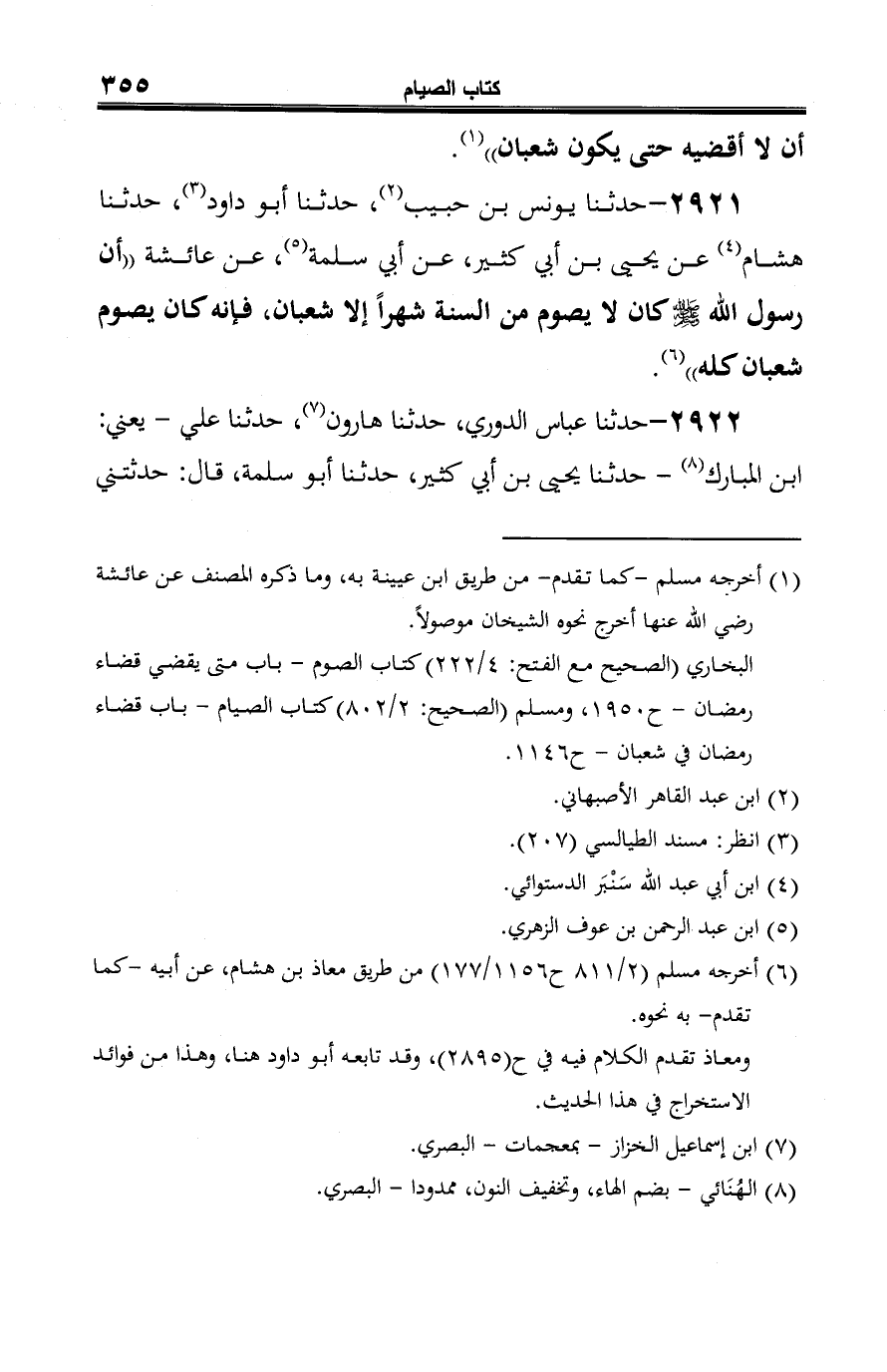 2921 - حدثنا يونس بن حبيب (¬1)، حدثنا أبو داود (¬2)، حدثنا هشام (¬3) عن يحيى بن أبي كثير، عن أبي سلمة (¬4)، عن عائشة "أن رسول الله -صلى الله عليه وسلم- كان لا يصوم من السنة شهرًا إلا شعبان، فإنه كان يصوم شعبان كله" (¬5).
