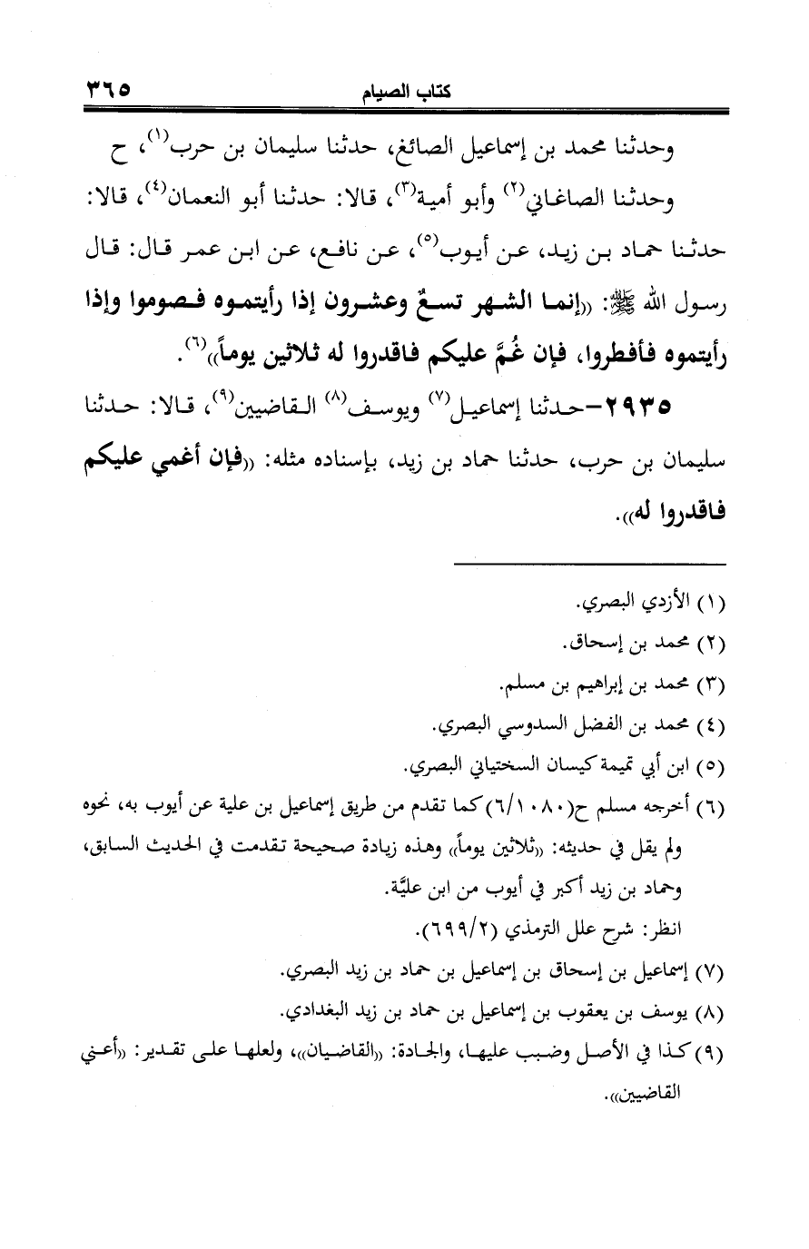 2935 - حدّثنا إسماعيل (¬1) ويوسف (¬2) القاضيين (¬3)، قالا: حدّثنا سليمان بن حرب، حدّثنا حماد بن زيد، بإسناده مثله: "فإن أغمي عليكم فاقدروا له".