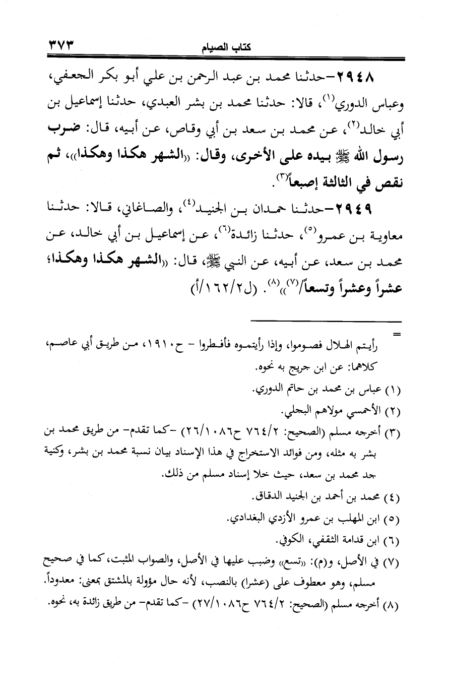 2949 - حدّثنا حمدان بن الجنيد (¬1)، والصاغاني، قالا: حدّثنا معاوية بن عمرو (¬2)، حدثنا زائدة (¬3)، عن إسماعيل بن أبي خالد، عن محمّد بن سعد، عن أبيه، عن النبي -صلى الله عليه وسلم-، قال: "الشهر هكذا وهكذا؟ عشرًا وعشرًا وتسعًا (¬4) " (¬5).