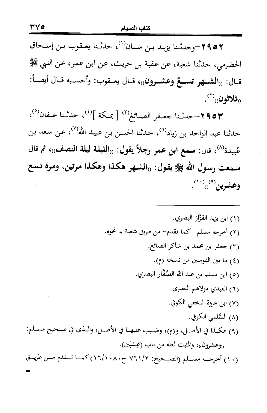 2953 - حدّثنا جعفر الصائغ (¬1) [بمكة] (¬2)، حدّثنا عفان (¬3)، حدّثنا عبد الواحد بن زياد (¬4)، حدّثنا الحسن بن عبيد الله (¬5)، عن سعد بن عُبيدة (¬6)، قال: سمع ابن عمر رجلًا يقول: "اللَّيلة ليلة النّصف"، ثمّ قال سمعت رسول الله -صلى الله عليه وسلم- يقول: "الشهر هكذا وهكذا مرتين، ومرة تسع وعشرين (¬7) " (¬8).