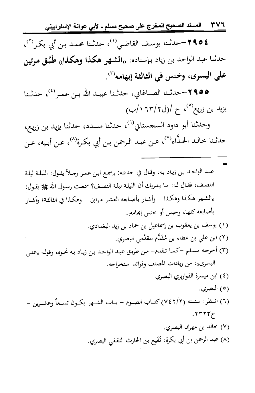 (¬6) أخرجه مسلم (الصّحيح: 2/ 766) كتاب الصِّيام -باب بيان معنى قوله -صلى الله عليه وسلم-: "شهرا عيدٍ لا ينقصان"- ح 1089/ 31، من طريق يزيد بن زريع، عن خالد به مثله، وفي إسناد المصنِّف بيان المهمل في خالد عند مسلم، وهذا من فوائد الاستخراج.