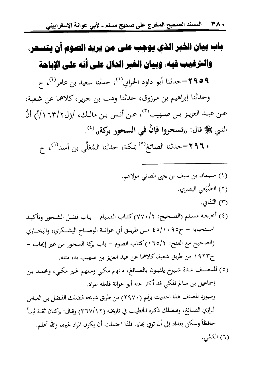 (¬4) أخرجه مسلم (الصّحيح: 2/ 770) كتاب الصِّيام -باب فضل السحور وتأكيد استحبابه - ح 1095/ 45 من طريق أبي عوانة الوضاح اليشكري، والبخاري (الصّحيح مع الفتح: 2/ 165) كتاب الصوم -باب بركة السحور من غير إيجاب- ح 1923 من طريق شعبة، كلاهما عن عبد العزيز بن صهيب به، مثله.