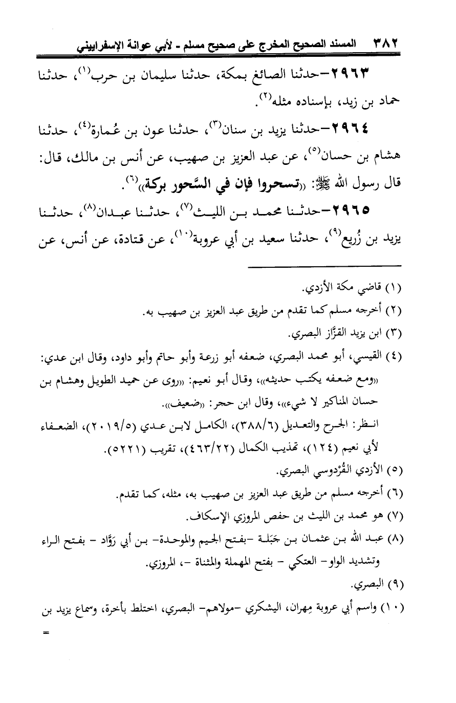 2964 - حدّثنا يزيد بن سنان (¬1)، حدّثنا عون بن عُمارة (¬2)، حدّثنا هشام بن حسان (¬3)، عن عبد العزيز بن صهيب، عن أنس بن مالك، قال: قال رسول الله -صلى الله عليه وسلم-: "تسحروا فإن في السَّحور بركة" (¬4).