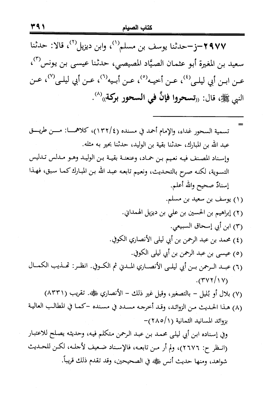 2977 - ز- حدّثنا يوسف بن مسلم (¬1)، وابن ديزيل (¬2)، قالا: حدّثنا سعيد بن المغيرة أبو عثمان الصيَّاد المصيصي، حدّثنا عيسى بن يونس (¬3)، عن ابن أبي ليلى (¬4)، عن أخيه (¬5)، عن أبيه (¬6)، عن أبي ليلى (¬7)، عن النبي -صلى الله عليه وسلم-، قال: "تسحروا فإنَّ في السحور بركة" (¬8).