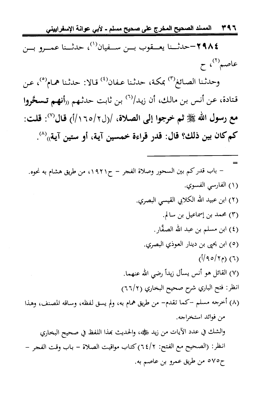 وحدثنا الصائغ (¬3) بمكة، حدّثنا عفان (¬4) قالا: حدّثنا همام (¬5)، عن قتادة، عن أنس بن مالك، أن زيد (¬6) بن ثابت حدثهم "أنهم تسحَّروا مع رسول الله - صلى الله عليه وسلم - ثمّ خرجوا إلى الصّلاة، قال (¬7): قلت: كم كان بين ذلك؟ قال: قدر قراءة خمسين آية، أو ستين آية" (¬8).