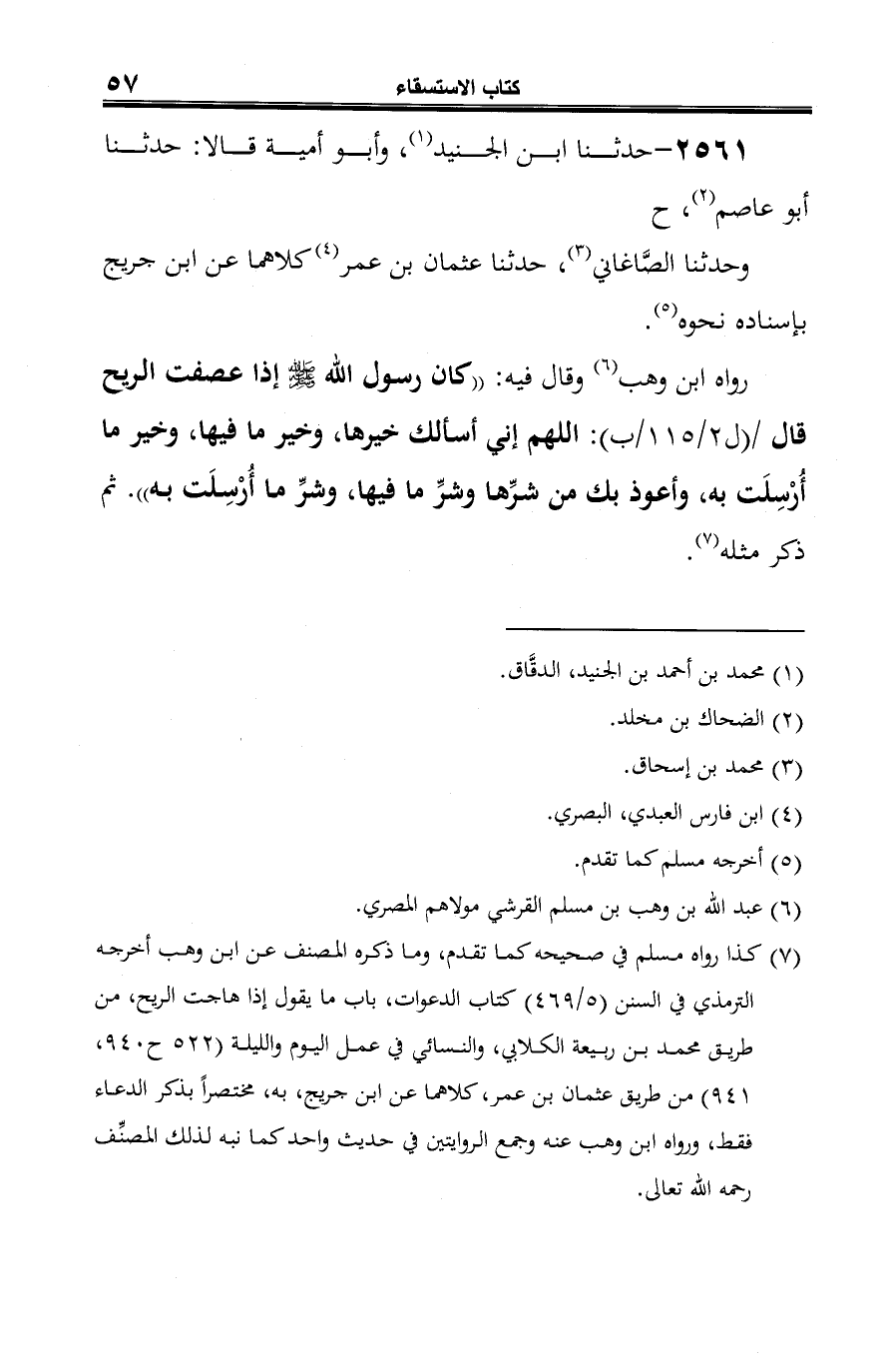 (¬7) كذا رواه مسلم في صحيحه كما تقدم، وما ذكره المصنف عن ابن وهب أخرجه الترمذي في السنن (5/ 469) كتاب الدعوات، باب ما يقول إذا هاجت الريح، من طريق محمد بن ربيعة الكلابي، والنسائي في عمل اليوم والليلة (522 ح 940، 941) من طريق عثمان بن عمر، كلاهما عن ابن جريج، به، مختصرًا بذكر الدعاء فقط، ودواه ابن وهب عنه وجمع الروايتين في حديث واحد كما نبه لذلك المصنِّف رحمه الله تعالى.