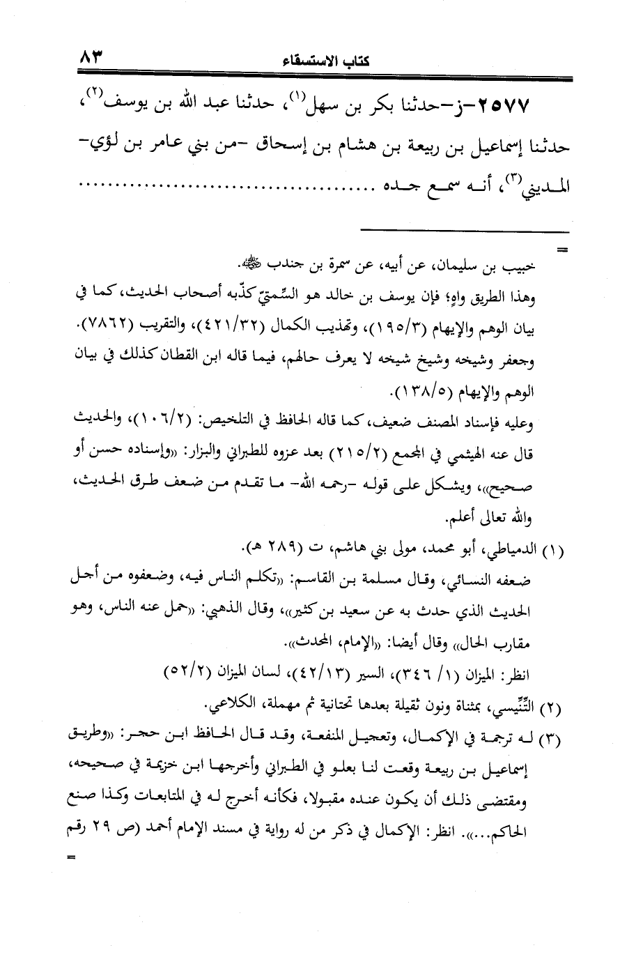 2577 - ز- حدثنا بكر بن سهل (¬1)، حدثنا عبد الله بن يوسف (¬2)، حدثنا إسماعيل بن ربيعة بن هشام بن إسحاق -من بني عامر بن لؤي- المديني (¬3)، أنه سمع جده