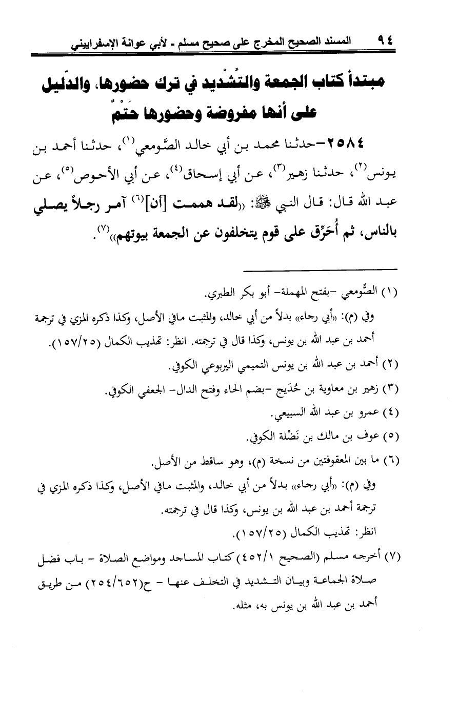 2584 - حدثنا محمد بن أبي خالد الصَّومعي (¬1)، حدثنا أحمد بن يونس (¬2)، حدثنا زهير (¬3)، عن أبي إسحاق (¬4)، عن أبي الأحوص (¬5)، عن عبد الله قال: قال النبي -صلى الله عليه وسلم-: "لقد هممت [أن] (¬6) آمر رجلًا يصلي بالناس، ثم أُحَرِّق على قوم يتخلفون عن الجمعة بيوتهم" (¬7).