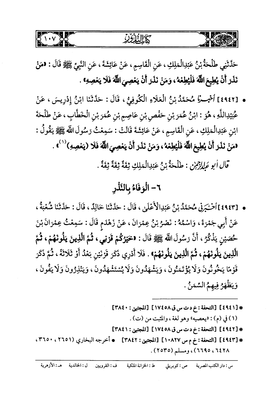 4942- أَخبَرنا مُحَمدُ بنُ العَلاءِ الكُوفِيُّ، قَالَ: حَدَّثنا ابْنُ إِدْرِيسَ، عَن عُبَيْدِ اللهِ، هُوَ ابْنُ عُمَرَ بنِ حَفْصِ بنِ عَاصِمِ بنِ عُمَرَ بنِ الخَطَّابِ، عَن طَلْحَةَ بنِ عَبدِ المَلِكِ، عَنِ القَاسِمِ، عَن عَائِشَةَ، قَالَتْ: سَمِعْتُ رَسُولَ اللهِ صَلى الله عَلَيهِ وسَلم يَقُولُ: مَنْ نَذَرَ أَنْ يُطِيعَ اللهَ فَلْيُطِعْهُ، وَمَنْ نَذَرَ أَنْ يَعْصِيَ اللهَ فَلا يَعْصِهِ.
