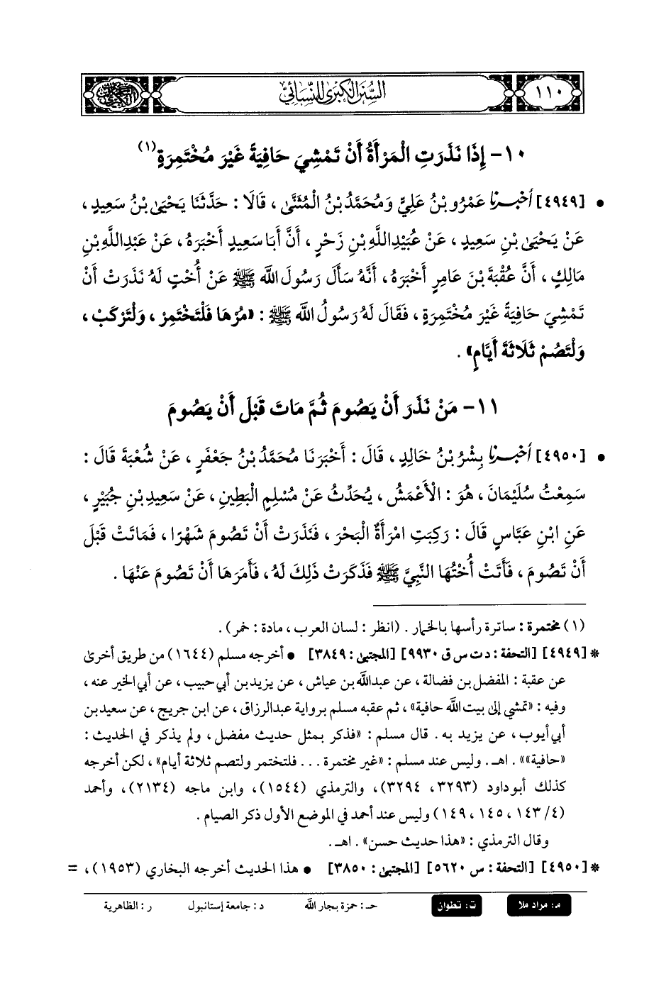 4949- أَخبَرنا عَمْرُو بنُ عَليٍّ، وَمُحَمدُ بنُ المُثَنَّى، قَالا: حَدَّثنا يَحْيَى بنُ سَعِيدٍ، عَن يَحْيَى بنِ سَعِيدٍ (1)، عَن عُبَيْدِ اللهِ بنِ زَحْرٍ، أَنَّ أَبَا سَعِيدٍ أَخْبَرَهُ (2)، عَن عَبدِ اللهِ بنِ مَالِكٍ، أَنَّ عُقْبَةَ بْنَ عَامِرٍ أَخْبَرَهُ، أَنَّهُ سَأَلَ رَسُولَ اللهِ صَلى الله عَلَيهِ وسَلم عَن أُخْتٍ لَهُ نَذَرَتْ أَنْ تَمْشِيَ حَافِيَةً، غَيْرَ مُخْتَمِرَةٍ، فَقَالَ لَهُ النَّبيُّ صَلى الله عَلَيهِ وسَلم: مُرْهَا فَلْتَخْتَمِرْ، وَلْتَرْكَبْ، وَلْتَصُمْ ثَلاثَةَ أَيَّامٍ.