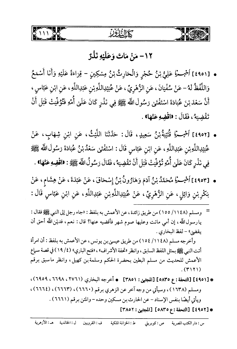 4952- أَخبَرنا قُتَيبَةُ بنُ سَعِيدٍ، قَالَ: حَدَّثنا اللَّيْثُ، عَنِ ابْنِ شِهَابٍ، عَن عُبَيْدِ اللهِ بنِ عَبدِ اللهِ، عَنِ ابْنِ عَبَّاسٍ، قَالَ: اسْتَفْتَى سَعْدُ بنُ عُبَادَةَ رَسُولَ اللهِ صَلى الله عَلَيهِ وسَلم فِي نَذْرٍ كَانَ عَلَى أُمِّهِ، تُوُفِّيَتْ قَبْلَ أَنْ تَقْضِيَهُ، فَقَالَ رَسُولُ اللهِ صَلى الله عَلَيهِ وسَلم: اقْضِهِ عَنهَا.
