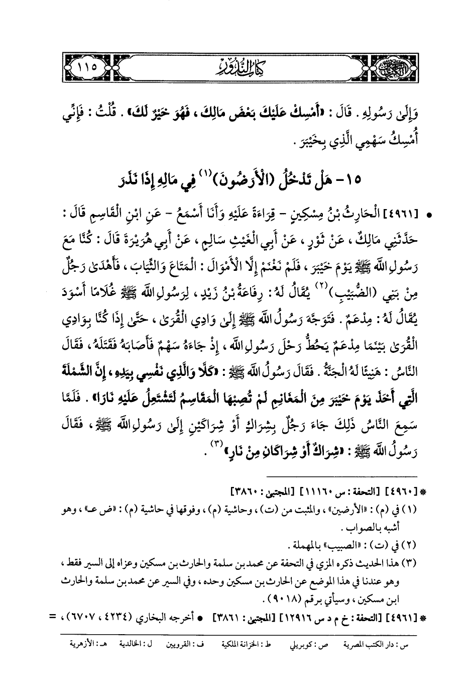 4961- الحَارِثُ بنُ مِسْكِينٍ، قِرَاءَةً عَلَيْهِ، وَأنا أَسْمَعُ، عَنِ ابْنِ القَاسِمِ، قَالَ: حَدَّثني مَالِكٌ، عَن ثَوْرٍ، عَن أَبي الغَيْثِ سَالِمٍ، عَن أَبي هُرَيْرَةَ، قَالَ: كُنَّا مَعَ رَسُولِ اللهِ صَلى الله عَلَيهِ وسَلم يَوْمَ خَيْبَرَ، فَلَمْ نَغْنَمْ إِلاَّ الأَمْوَالَ المَتَاعَ وَالثِّيَابَ، فَأَهْدَى رَجُلٌ مِنْ بَنِي الضُّبَيْبِ، يُقَالُ لَهُ: رِفَاعَةُ بنُ زَيْدٍ لِرَسُولِ اللهِ صَلى الله عَلَيهِ وسَلم غُلامًا أَسْوَدَ، يُقَالُ لَهُ: مِدْعَمٌ، فَتَوَجَّهَ رَسُولُ اللهِ صَلى الله عَلَيهِ وسَلم إِلَى وَادِي القُرَى حَتَّى إِذَا كُنَّا بِوَادِي القُرَى، بَيْنَمَا مِدْعَمٌ يَحُطُّ رَحْلَ رَسُولِ اللهِ صَلى الله عَلَيهِ وسَلم، إِذْ جَاءَهُ سَهْمٌ فَأَصَابَهُ فَقَتَلَهُ، فَقَالَ النَّاسُ: هَنِيئًا لَهُ الجَنَّةُ، فَقَالَ رَسُولُ اللهِ صَلى الله عَلَيهِ وسَلم: كَلاَّ وَالَّذِي نَفْسِي بِيَدِهِ، إِنَّ الشَّمْلَةَ الَّتِي أَخَذَ يَوْمَ خَيْبَرَ مِنَ المَغَانِمِ لَمْ تُصِبْهَا المَقَاسِمُ لَتَشْتَعِلُ عَلَيْهِ نَارًا، فَلَمَّا سَمِعَ النَّاسُ ذَلِكَ، جَاءَ رَجُلٌ بِشِرَاكٍ أَوْ شِرَاكَيْنِ إِلَى رَسُولِ اللهِ صَلى الله عَلَيهِ وسَلم، فَقَالَ رَسُولُ اللهِ صَلى الله عَلَيهِ وسَلم: شِرَاكٌ أَوْ شِرَاكَانِ مِنْ نَارٍ.