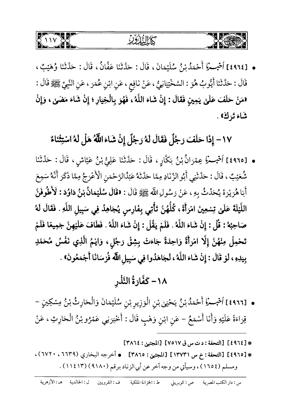 17- إِذَا حَلَفَ رَجُلٌ فَقَالَ لَهُ رَجُلٌ إِنْ شَاءَ اللهُ هَلْ لَهُ اسْتِثْنَاءٌ.