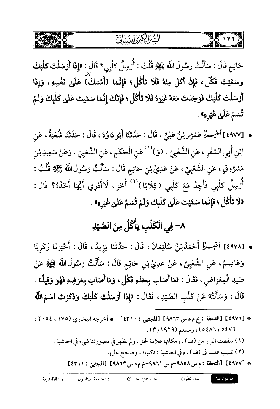 4977- أَخبَرنا عَمْرُو بنُ عَليٍّ، قَالَ: حَدَّثنا أَبو دَاوُدَ، قَالَ: حَدَّثنا شُعْبَةَ، عَنِ ابْنِ أَبي السَّفَرِ، عَنِ الشَّعْبِيِّ. وَعَنِ الحَكَمِ، عَنِ الشَّعْبِيِّ. وَعَن سَعِيدِ بنِ مَسْرُوقٍ، عَنِ الشَّعْبِيِّ، عَن عَدِيِّ بنِ حَاتِمٍ، قَالَ: سَأَلْتُ رَسُولَ اللهِ صَلى الله عَلَيهِ وسَلم، قُلْتُ: أُرْسِلُ كَلْبِي فَأَجِدُ مَعَ كَلْبِي كِلابًا أُخَرَ لا أَدْرِي أَيُّهَا أَخَذَهُ، قَالَ: لا تَأْكُلْ، فَإِنَّمَا سَمَّيْتَ عَلَى كَلْبِكَ، وَلَمْ تُسَمِّ عَلَى غَيْرِهِ.