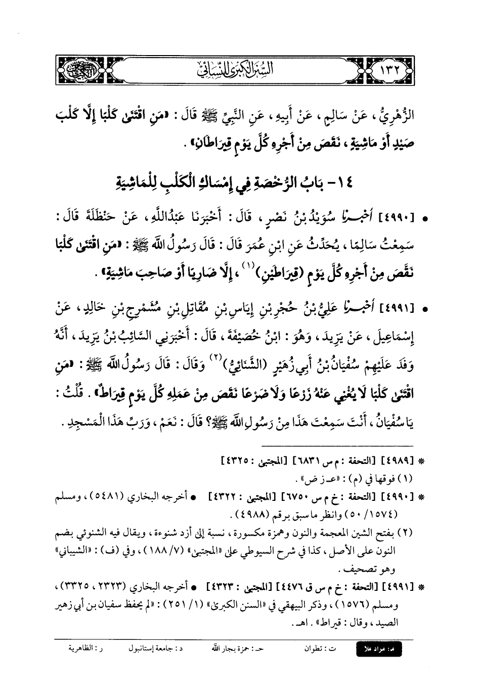 4990- أَخبَرنا سُوَيْدُ بنُ نَصْرِ، قَالَ: أَخبَرنا عَبدُ اللهِ، عَن حَنْظَلَةَ، قَالَ: سَمِعْتُ سَالِمًا يُحَدِّثُ عَنِ ابْنِ عُمَرَ، قَالَ: قَالَ رَسُولُ اللهِ صَلى الله عَلَيهِ وسَلم: مَنِ اقْتَنَى كَلْبًا نَقَصَ مِنْ أَجْرِهِ كُلَّ يَوْمٍ قِيرَاطَينِ، إِلاَّ ضَارِيًا، أَوْ صَاحِبَ مَاشِيَةٍ.