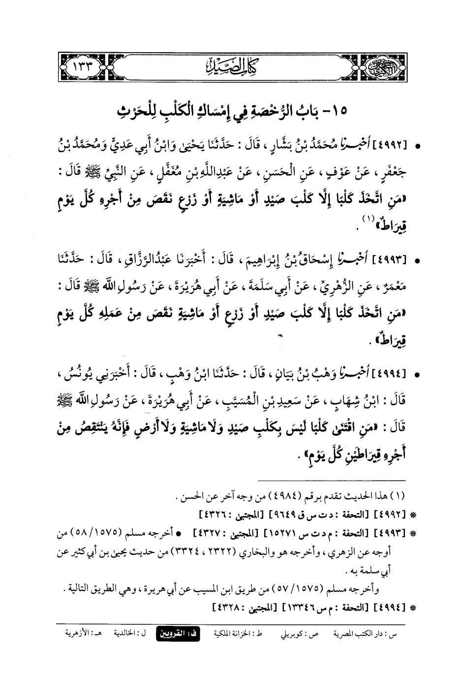 4992- أَخبَرنا مُحَمدُ بنُ بَشَّارٍ، قَالَ: حَدَّثنا يَحْيَى، وَابْنُ أَبي عَدِيٍّ، وَمُحَمدُ بنُ جَعْفَرٍ، عَن عَوْفٍ، عَنِ الحَسَنِ، عَن عَبدِ اللهِ بنِ مُغَفَّلٍ، عَنِ النَّبيِّ صَلى الله عَلَيهِ وسَلم قَالَ: مَنِ اتَّخَذَ كَلْبًا إِلاَّ كَلْبَ صَيْدٍ أَوْ مَاشِيَةٍ أَوْ زَرْعٍ، نَقَصَ مِنْ أَجْرِهِ كُلَّ يَوْمٍ قِيرَاطٌ.
