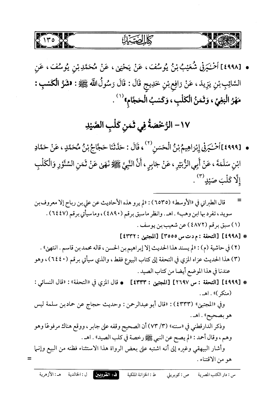 4999- أَخْبَرَنِي إِبْرَاهِيمُ بنُ الحَسَنِ، قَالَ: حَدَّثنا حَجَّاجُ بنُ مُحَمدٍ، عَن حَمَّادِ بنِ سَلَمَةَ، عَن أَبي الزُّبَيْرِ، عَن جَابِرٍ (1)، أَنَّ النَّبيَّ صَلى الله عَلَيهِ وسَلم نَهَى عَن ثَمَنِ السِّنَّوْرِ، وَالكَلْبِ، إِلاَّ كَلْبَ صَيْدٍ.