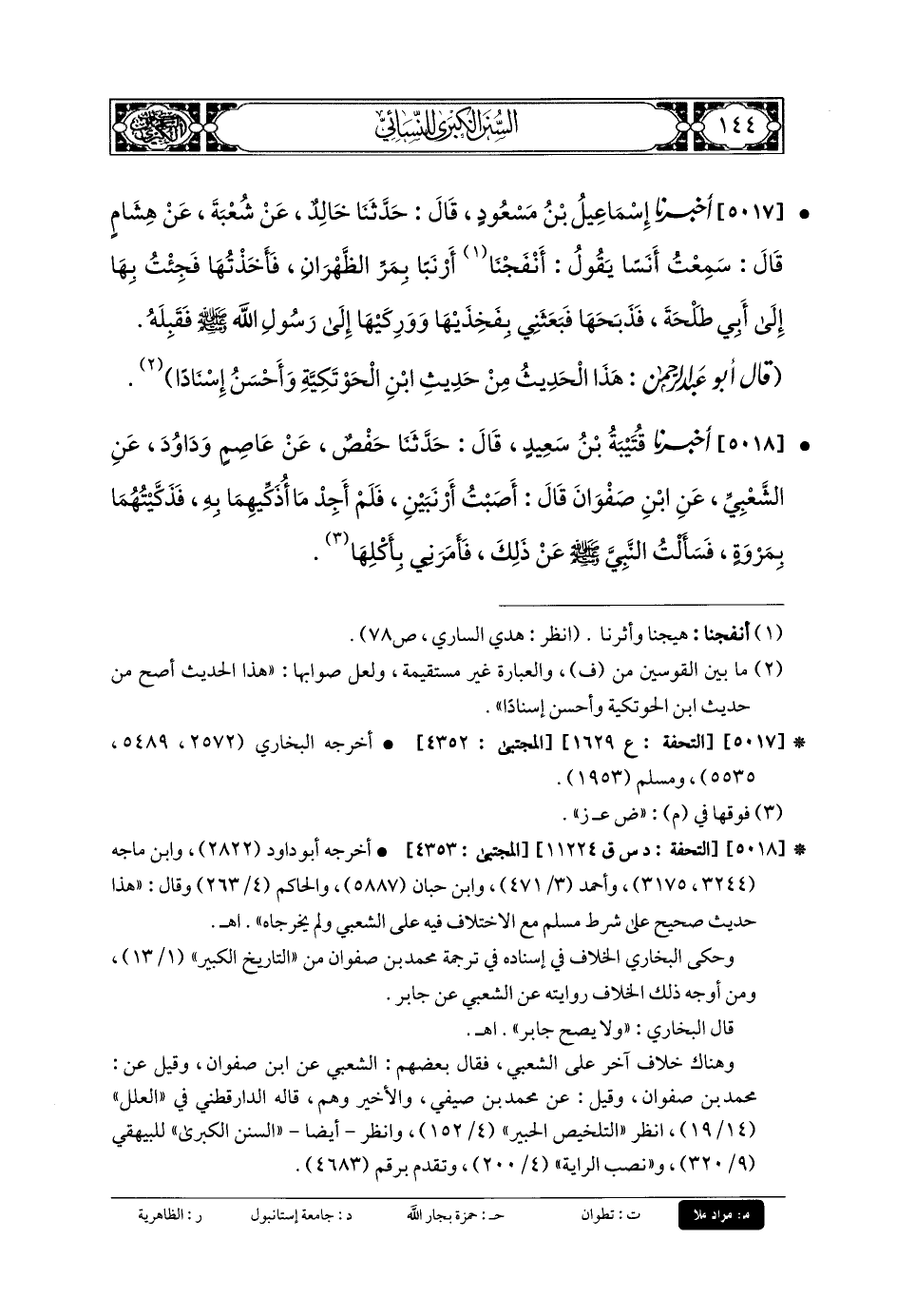 (1) تصحف في طبعة التأصيل إلى: (بِأَكْلِهَا) وجاء على الصواب في طبعة الرسالة (4806)، «المُجتبى» طبعة التأصيل (4353).
