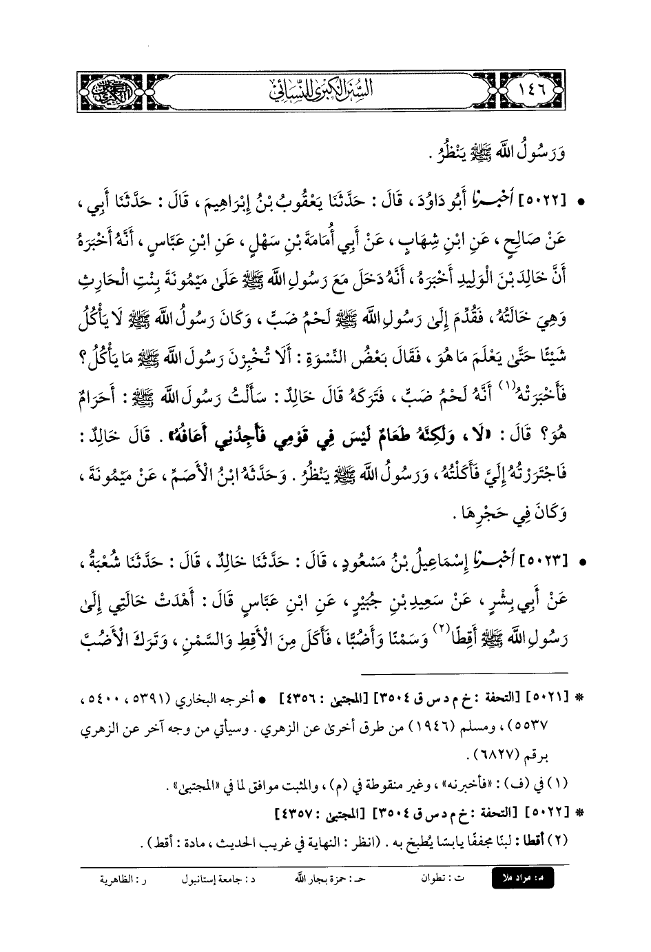 5022- أَخبَرنا أَبو دَاوُدَ، قَالَ: حَدَّثنا يَعْقُوبُ بنُ إِبْرَاهِيمَ، قَالَ: حَدَّثنا أَبي، عَن صَالِحٍ، عَنِ ابْنِ شِهَابٍ، عَن أَبي أُمَامَةَ بنِ سَهْلٍ، عَنِ ابْنِ عَبَّاسٍ، أَنَّهُ أَخْبَرَهُ؛ أَنَّ خَالِدَ بْنَ الوَلِيدِ أَخْبَرَهُ، أَنَّهُ دَخَلَ مَعَ رَسُولِ اللهِ صَلى الله عَلَيهِ وسَلم عَلَى مَيْمُونَةَ بِنْتِ الحَارِثِ وَهِيَ خَالَتُهُ، فَقُدِّمَ إِلَى رَسُولِ اللهِ صَلى الله عَلَيهِ وسَلم لَحْمُ ضَبٍّ، وَكَانَ رَسُولُ اللهِ صَلى الله عَلَيهِ وسَلم لا يَأْكُلُ شَيْئًا حَتَّى يَعْلَمَ مَا هُوَ، فَقَالَ بَعْضُ النِّسْوَةِ: أَلا تُخْبِرْنَ رَسُولَ اللهِ صَلى الله عَلَيهِ وسَلم مَا يَأْكُلُ؟ فَأَخْبَرَتهُ أَنَّهُ لَحْمُ ضَبٍّ، فَتَرَكَهُ، قَالَ خَالِدٌ: سَأَلْتُ رَسُولَ اللهِ صَلى الله عَلَيهِ وسَلم أَحَرَامٌ هُوَ؟ قَالَ: لا، وَلَكِنَّهُ طَعَامٌ لَيْسَ فِي قَوْمِي فَأَجِدُنِي أَعَافُهُ، قَالَ خَالِدٌ: فَاجْتَرَرْتُهُ إِلَيَّ، فَأَكَلْتُهُ وَرَسُولُ اللهِ صَلى الله عَلَيهِ وسَلم يَنْظُرُ.