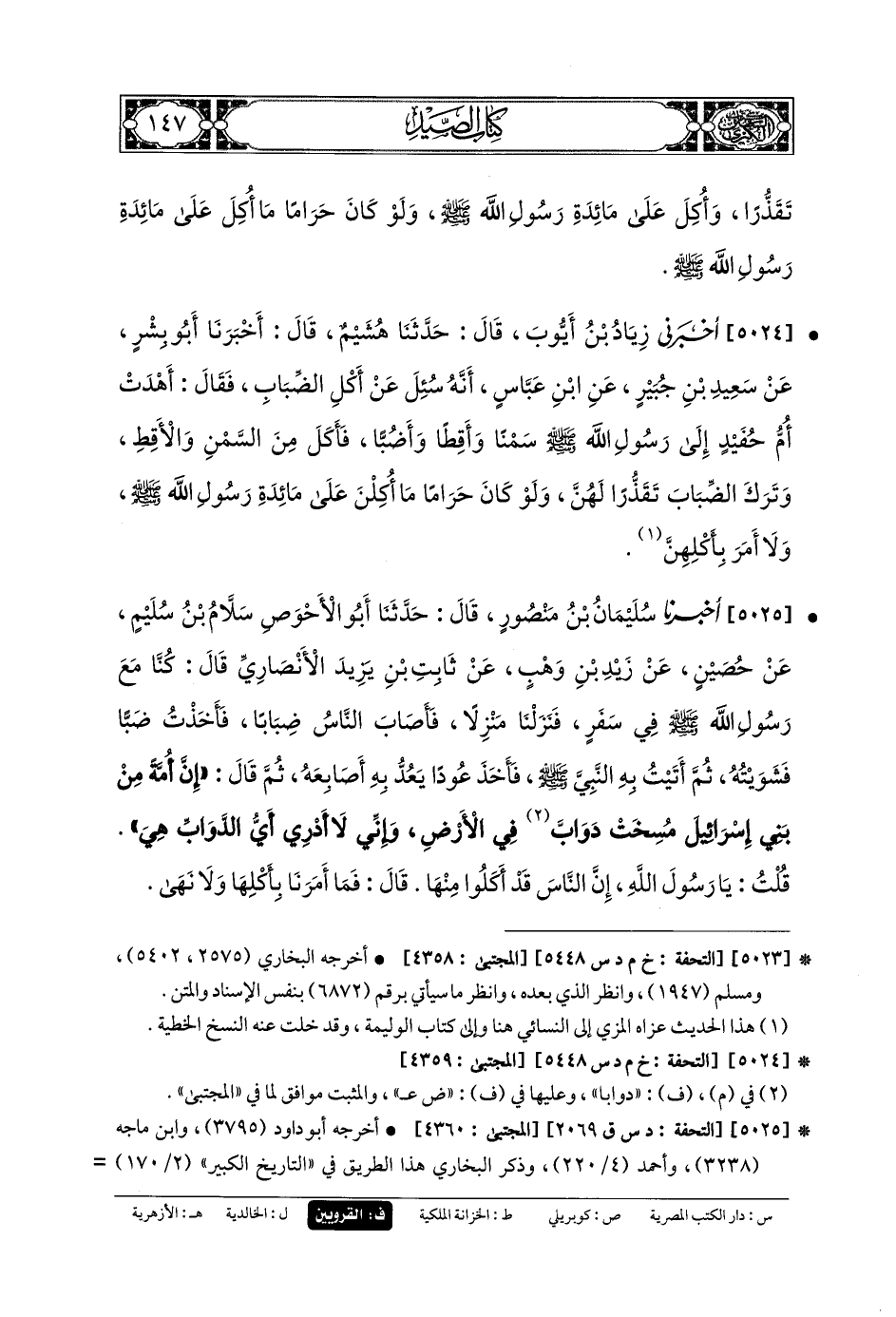 5024- أَخْبَرَنِي زِيَادُ بنُ أَيوبَ، قَالَ: حَدَّثنا هُشَيْمٌ، قَالَ: أَخبَرنا أَبو بِشْرٍ، عَن سَعِيدِ بنِ جُبَيْرٍ، عَنِ ابْنِ عَبَّاسٍ، أَنَّهُ سُئِلَ عَن أَكْلِ الضِّبَابِ، فَقَالَ: أَهْدَتْ أُمُّ حُفَيْدٍ إِلَى رَسُولِ اللهِ صَلى الله عَلَيهِ وسَلم سَمْنًا، وَأَقِطًا، وَأَضُبًّا، فَأَكَلَ مِنَ السَّمْنِ، وَالأَقِطِ، وَتَرَكَ الضِّبَابَ تَقَذُّرًا لَهُنَّ، وَلَوْ كَانَ حَرَامًا مَا أُكِلنَ عَلَى مَائِدَةِ رَسُولِ اللهِ صَلى الله عَلَيهِ وسَلم، وَلا أَمَرَ بِأَكْلِهِنَّ.