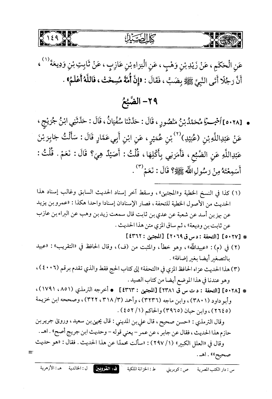 5028- أَخبَرنا مُحَمدُ بنُ مَنْصُورٍ، قَالَ: حَدَّثنا سُفيانُ، قَالَ: حَدَّثني ابْنُ جُرَيْجٍ، عَن عَبدِ اللهِ بنِ عُبَيْدِ بنِ عُمَيْرٍ، عَنِ ابْنِ أَبي عَمَّارٍ، قَالَ: سَأَلْتُ جَابِرَ بْنَ عَبدِ اللهِ عَنِ الضَّبُعِ، فَأَمَرَنِي بِأَكْلِهَا، قُلْتُ: أَصَيْدٌ هِيَ؟ قَالَ: نَعَمْ، قُلْتُ: أَسَمِعْتَهُ مِنْ رَسُولِ اللهِ صَلى الله عَلَيهِ وسَلم؟ قَالَ: نَعَمْ.