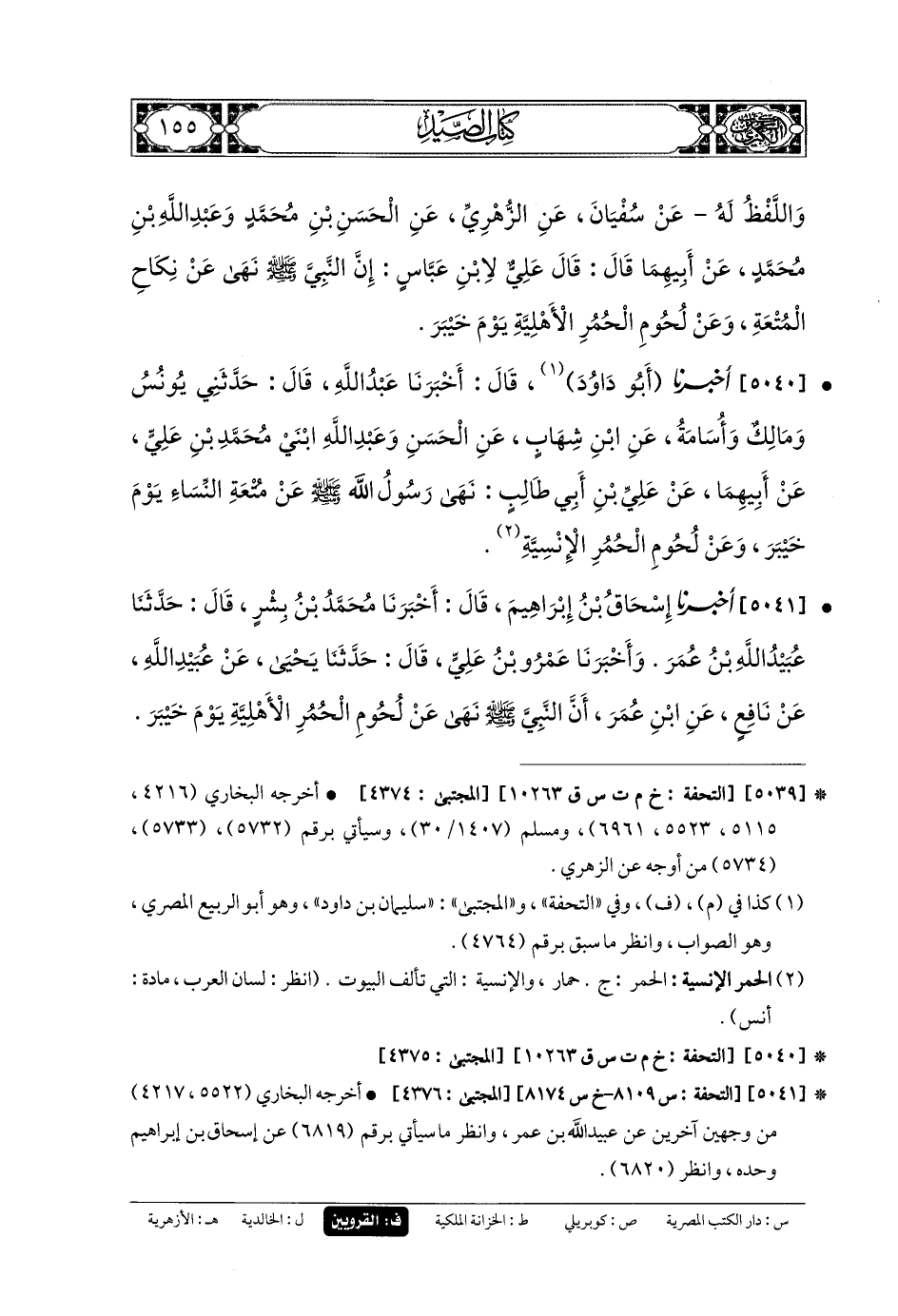 5040- أَخبَرنا أَبو دَاوُدَ، قَالَ: أَخبَرنا عَبدُ اللهِ، قَالَ: حَدَّثني يُونُسُ، وَمَالِكٌ، وَأُسَامَةُ، عَنِ ابْنِ شِهَابٍ، عَنِ الحَسَنِ، وَعَبدِ اللهِ ابْنَيْ مُحَمدِ بنِ عَليٍّ، عَن أَبيهِمَا، عَن عَليِّ بنِ أَبي طَالِبٍ: نَهَى رَسُولُ اللهِ صَلى الله عَلَيهِ وسَلم عَن مُتْعَةِ النِّسَاءِ يَوْمَ خَيْبَرَ، وَعَن لُحُومِ الحُمُرِ الإِنْسِيَّةِ.