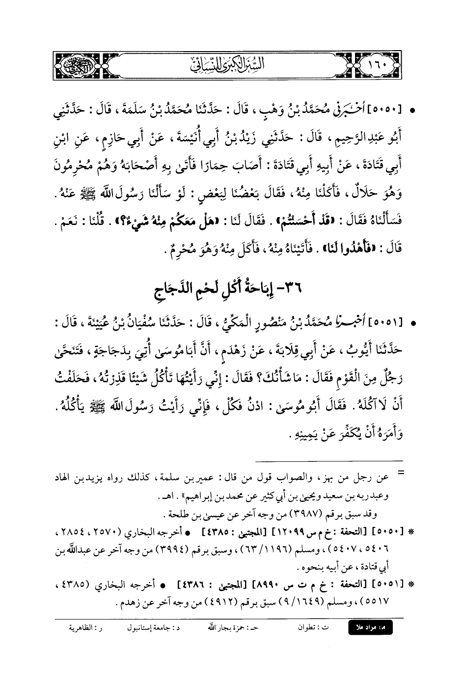 5050- أَخْبَرَنِي مُحَمدُ بنُ وَهْبٍ، قَالَ: حَدَّثنا مُحَمدُ بنُ سَلَمَةَ، قَالَ: حَدَّثني أَبو عَبدِ الرَّحِيمِ، قَالَ: حَدَّثني زَيْدُ بنُ أَبي أُنَيْسَةَ، عَن أَبي حَازِمٍ، عَنِ ابْنِ أَبي قَتَادَةَ، عَن أَبيهِ أَبي قَتَادَةَ: أَصَابَ حِمَارًا فَأَتَى بِهِ أَصْحَابَهُ وَهُمْ مُحْرِمُونَ، وَهُوَ حَلالٌ، فَأَكَلْنَا مِنْهُ، فَقَالَ بَعْضُنَا لِبَعْضٍ: لَوْ سَأَلْنَا رَسُولَ اللهِ صَلى الله عَلَيهِ وسَلم عَنهُ، فَسَأَلْنَاهُ، فَقَالَ: قَدْ أَحْسَنْتُمْ، فَقَالَ لَنَا: هَلْ مَعَكُمْ مِنْهُ شَيْءٌ؟ قُلْنَا: نَعَمْ، قَالَ: فَأَهْدُوا لَنَا، قَالَ: فَأَتَيْنَاهُ مِنْهُ، فَأَكَلَ مِنْهُ وَهُوَ مُحْرِمٌ.