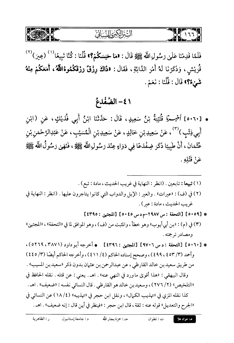 5060- أَخبَرنا قُتَيبَةُ بنُ سَعِيدٍ، قَالَ: حَدَّثنا ابْنُ أَبي فُدَيْكٍ، عَنِ ابْنِ أَبي ذئْبٍ، عَن سَعِيدِ بنِ خَالِدٍ، عَن سَعِيدِ بنِ المُسَيَّبِ، عَن عَبدِ الرَّحمَنِ بنِ عُثْمَانَ، أَنَّ طَبِيبًا ذَكَرَ ضِفْدَعًا فِي دَوَاءٍ عِنْدَ رَسُولِ اللهِ صَلى الله عَلَيهِ وسَلم، فَنَهَى رَسُولُ اللهِ صَلى الله عَلَيهِ وسَلم عَن قَتْلِهِ.