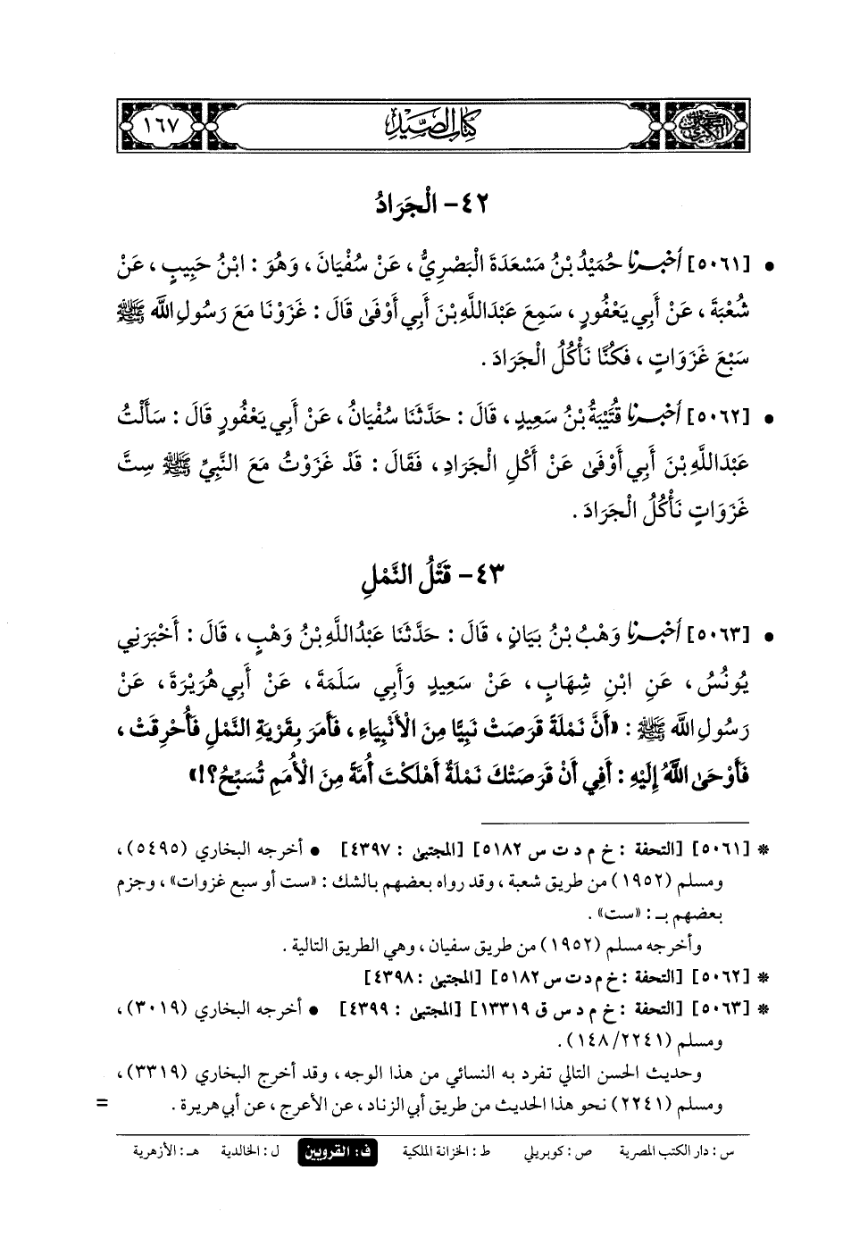 5062- أَخبَرنا قُتَيبَةُ بنُ سَعِيدٍ، قَالَ: حَدَّثنا سُفيانُ، عَن أَبي يَعْفُورَ، قَالَ: سَأَلْتُ عَبدَ اللهِ بْنَ أَبي أَوْفَى عَنِ أَكْلِ الجَرَادِ، فَقَالَ: قَدْ غَزَوْتُ مَعَ النَّبيِّ صَلى الله عَلَيهِ وسَلم سِتَّ غَزَوَاتٍ نَأْكُلُ الجَرَادَ.