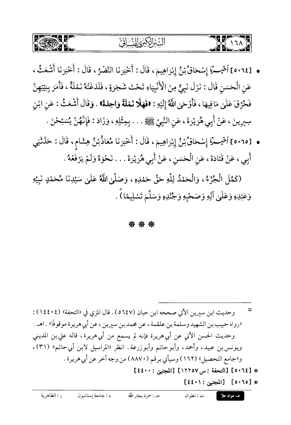 5065- أَخبَرنا إِسحَاقُ بنُ إِبْرَاهِيمَ، قَالَ: أَخبَرنا مُعَاذُ بنُ هِشَامٍ، قَالَ: حَدَّثني أَبي، عَن قَتَادَةَ، عَنِ الحَسَنِ، عَن أَبي هُرَيْرَةَ ... نَحْوَهُ، وَلَمْ يَرْفَعْهُ.