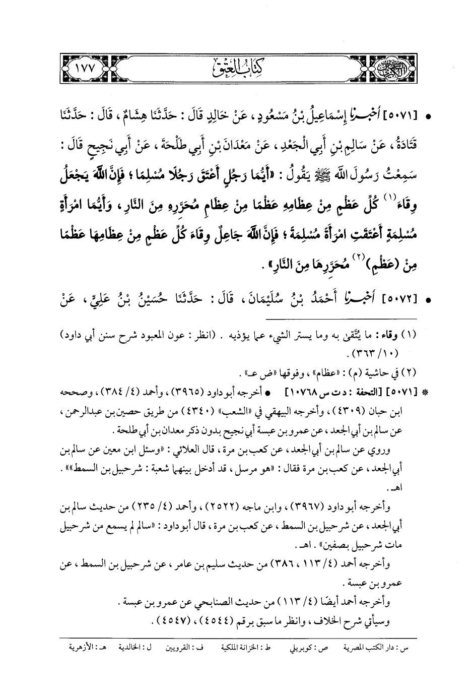 5072- أَخبَرنا أَحْمَدُ بنُ سُلَيْمَانَ، قَالَ: حَدَّثنا حُسَيْنُ بنُ عَليٍّ، عَن زَائِدَةَ، عَن مَنْصُورٍ (1)، عَن سَالِمِ بنِ أَبي الجَعْدِ، قَالَ: حُدِّثْتُ عَن كَعْبِ بنِ مُرَّةَ البَهْزِيِّ، قَالَ: سَأَلْتُ رَسُولَ اللهِ صَلى الله عَلَيهِ وسَلم أَيُّ اللَّيْلِ أَسْمَعُ؟ قَالَ: جَوْفُ اللَّيْلِ الآخِرِ، قَالَ: وَكَانَ يَقُولُ: أَيُّمَا امْرِئٍ مُسْلِمٍ أَعْتَقَ امْرَءًا مُسْلِمًا، فَهُوَ فِكَاكُهُ مِنَ النَّارِ، يُجْزِئُ كُلُّ عَظْمٍ مِنْهُ عَظْمًا، وَأَيُّمَا مَسْلَمَةٍ أَعْتَقَتِ امْرَأَةً مُسْلِمَةً، فَهُوَ فِكَاكُهَا مِنَ النَّارِ كُلُّ عَظْمٍ مِنْهَا عَظْمٌ مِنْهَا.