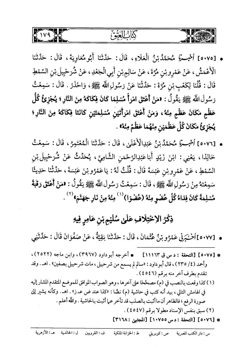 5076- أَخبَرنا مُحَمدُ بنُ عَبدِ الأَعْلَى، قَالَ: حَدَّثنا المُعْتَمِرُ، قَالَ: سَمِعْتُ خَالِدًا، يَعْنِي ابْنَ زَيْدٍ أَبَا عَبدِ الرَّحمَنِ الشَّامِيَّ، يُحَدِّثُ عَن شُرَحْبِيلِ بنِ السِّمْطِ، عَن عَمْرِو بنِ عَبَسَةَ، قَالَ: قُلْتُ لَهُ: يَا عَمْرُو بْنَ عَبَسَةَ، حَدِّثْنَا حَدِيثًا سَمِعْتَهُ مِنْ رَسُولِ اللهِ صَلى الله عَلَيهِ وسَلم، قَالَ: سَمِعْتُ رَسُولَ اللهِ صَلى الله عَلَيهِ وسَلم يَقُولُ: مَنْ أَعْتَقَ رَقَبَةً مُسْلِمَةً، كَانَ فِدَاءُ كُلِّ عُضْوٍ مِنْهُ عُضْوًا مِنْهُ مِنْ نَارِ جَهَنَّمَ.
