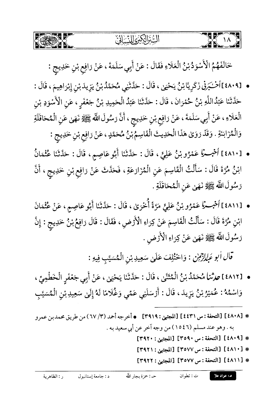 4810 - أَخبَرنا عَمْرُو بنُ عَليٍّ، قَالَ: حَدَّثنا أَبو عَاصِمٍ، قَالَ: حَدَّثنا عُثْمَانُ بنُ مُرَّةَ قَالَ: سَأَلْتُ القَاسِمَ عَنِ المُزَارَعَةِ، فَحَدَّثَ عَن رَافِعِ بنِ خَدِيجٍ، أَنَّ رَسُولَ اللهِ صَلى الله عَلَيهِ وسَلم نَهَى عَنِ المُحَاقَلَةِ، وَالمُزَابَنَةِ (1).