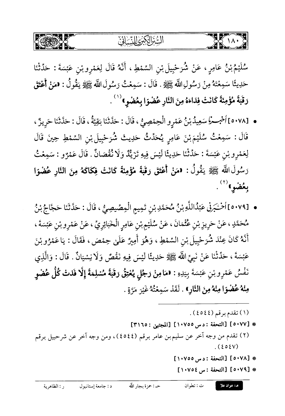 5079- أَخْبَرَنِي عَبدُ اللهِ بنُ مُحَمدِ بنِ تَمِيمٍ المِصِّيصِيُّ، قَالَ: حَدَّثنا حَجَّاجُ بنُ مُحَمدٍ، عَن حَرِيزِ بنِ عُثْمَانَ، عَن سُلَيْمِ بنِ عَامِرٍ الخَبَائِرِيِّ، عَن عَمْرِو بنِ عَبَسَةَ، أَنَّهُ كَانَ عِنْدَ شُرَحْبِيلِ بنِ السِّمْطِ وَهُوَ أَمِيرٌ عَلَى حِمْصَ، فَقَالَ: يَا عَمْرُو بْنَ عَبَسَةَ، حَدِّثْنَا عَن نَبِيِّ اللهِ صَلى الله عَلَيهِ وسَلم حَدِيثًا لَيْسَ فِيهِ نَقْصٌ وَلا نِسْيَانٌ، قَالَ: وَالَّذِي نَفْسُ عَمْرِو بنِ عَبَسَةَ بِيَدِهِ، مَا مِنْ رَجُلٍ يُعْتِقُ رَقَبَةً مُسْلِمَةً، إِلاَّ فَدَتْ كُلَّ عُضْوٍ مِنْهُ عُضْوًا مِنْهُ مِنَ النَّارِ، لَقَدْ سَمِعْتُهُ غَيْرَ مَرَّةٍ.