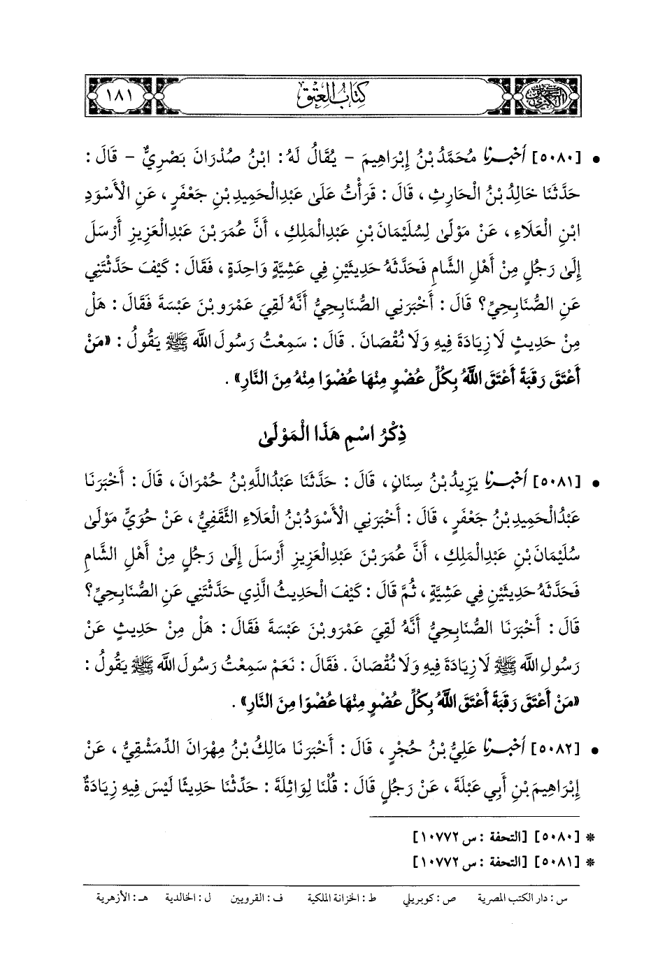 5080- أَخبَرنا مُحَمدُ بنُ إِبْرَاهِيمَ، يُقَالُ لَهُ: ابْنُ صُدْرَانَ، بَصْرِيٌّ، قَالَ: حَدَّثنا خَالِدُ بنُ الحَارِثِ، قَالَ: قَرَأْتُ عَلَى عَبدِ الحَمِيدِ بنِ جَعْفَرٍ، عَنِ الأَسْوَدِ بنِ العَلاءِ، عَن مَوْلًى لِسُلَيْمَانَ بنِ عَبدِ المَلِكِ، أَنَّ عُمَرَ بْنَ عَبدِ العَزِيزِ أَرْسَلَ إِلَى رَجُلٍ مِنْ أَهْلِ الشَّامِ فَحَدَّثَهُ حَدِيثَيْنِ فِي عَشِيَّةٍ وَاحِدَةٍ، فَقَالَ: كَيْفَ حَدَّثْتَنِي عَنِ الصُّنَابِحِيِّ؟ قَالَ: أَخْبَرَنِي الصُّنَابِحِيُّ، أَنَّهُ لَقِيَ عَمْرَو بْنَ عَبَسَةَ، فَقَالَ: هَلْ مِنْ حَدِيثٍ لا زِيَادَةَ فِيهِ وَلا نُقْصَانَ؟ قَالَ: سَمِعْتُ رَسُولَ اللهِ صَلى الله عَلَيهِ وسَلم يَقُولُ: مَنْ أَعْتَقَ رَقَبَةً أَعْتَقَ اللهُ بِكُلِّ عُضْوٍ مِنْهَا عُضْوًا مِنْهُ مِنَ النَّارِ.