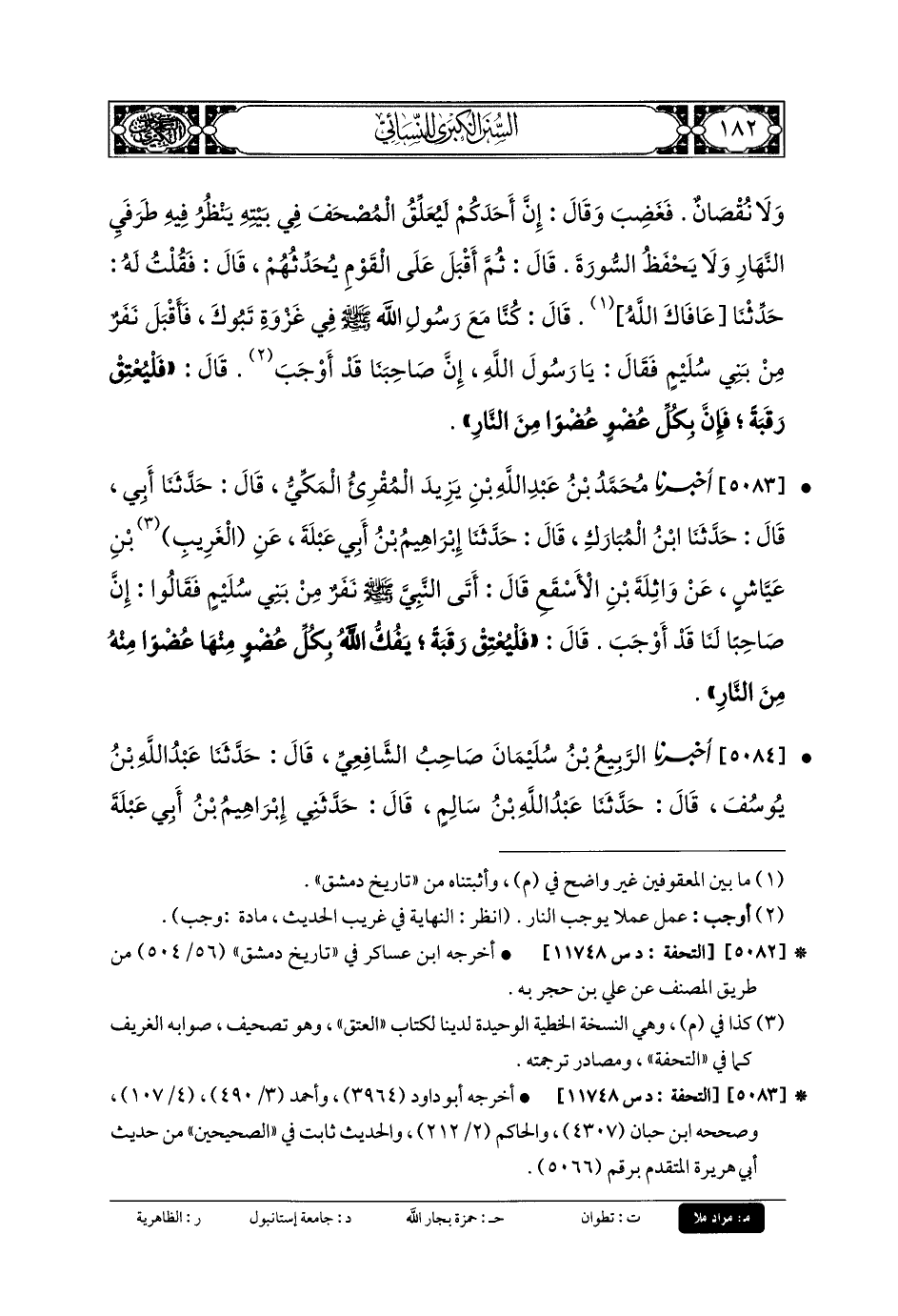 5084- أَخبَرنا الرَّبِيعُ بنُ سُلَيْمَانَ، صَاحِبُ الشَّافِعِيِّ، قَالَ: حَدَّثنا عَبدُ اللهِ بنُ يُوسُفَ، قَالَ: حَدَّثنا عَبدُ اللهِ بنُ سَالِمٍ، قَالَ: حَدَّثني إِبْرَاهِيمُ بنُ أبي عَبْلَةَ، قَالَ: كُنْتُ جَالِسًا بِأَرِيحَا، فَمَرَّ بِي وَاثِلَةُ بنُ الأَسْقَعِ مُتَوَكِّئًا عَلَى عَبدِ اللهِ بنِ الدَّيْلَمِيِّ فَأَجَلَسَهُ، ثُمَّ جَاءَ إِلَيَّ، فَقَالَ: عَجَبٌ مَا حَدَّثني الشَّيْخُ، يَعْنِي وَاثِلَةَ، قُلْتُ: مَا حَدَّثَكَ؟ قَالَ: كُنَّا مَعَ النَّبيِّ صَلى الله عَلَيهِ وسَلم فِي غَزْوَةِ تَبُوكَ، فَأَتَاهُ نَفَرٌ مِنْ بَنِي سُلَيْمٍ فَقَالُوا: يَا رَسُولَ اللهِ إِنَّ صَاحِبَنَا قَدْ أَوْجَبَ، فَقَالَ رَسُولُ اللهِ صَلى الله عَلَيهِ وسَلم: أَعْتِقُوا عَنهُ رَقَبَةً، يُعْتِقِ اللهُ بِكُلِّ عُضْوٍ مِنْهَا عُضْوًا مِنْهُ مِنَ النَّارِ.