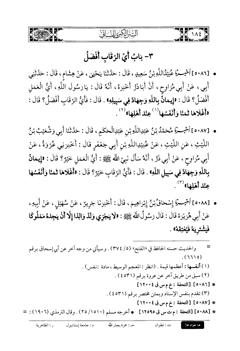 5086- أَخبَرنا عُبَيْدُ اللهِ بنُ سَعِيدٍ، قَالَ: حَدَّثنا يَحْيَى، عَن هِشَامٍ، قَالَ: حَدَّثني أَبي، عَن أَبي مُرَاوِحٍ، أَنَّ أَبَا ذَرٍّ أَخْبَرَهُ أَنَّهُ قَالَ: يَا رَسُولَ اللهِ أَيُّ العَمَلِ أَفْضَلُ قَالَ: إِيمَانٌ بِاللهِ، وَجِهَادٌ فِي سَبِيلِهِ، قَالَ: فَأَيُّ الرِّقَابِ أَفْضَلُ؟ قَالَ: أَغْلاهَا ثَمَنًا، وَأَنْفَسُهَا عِنْدَ أَهْلِهَا.